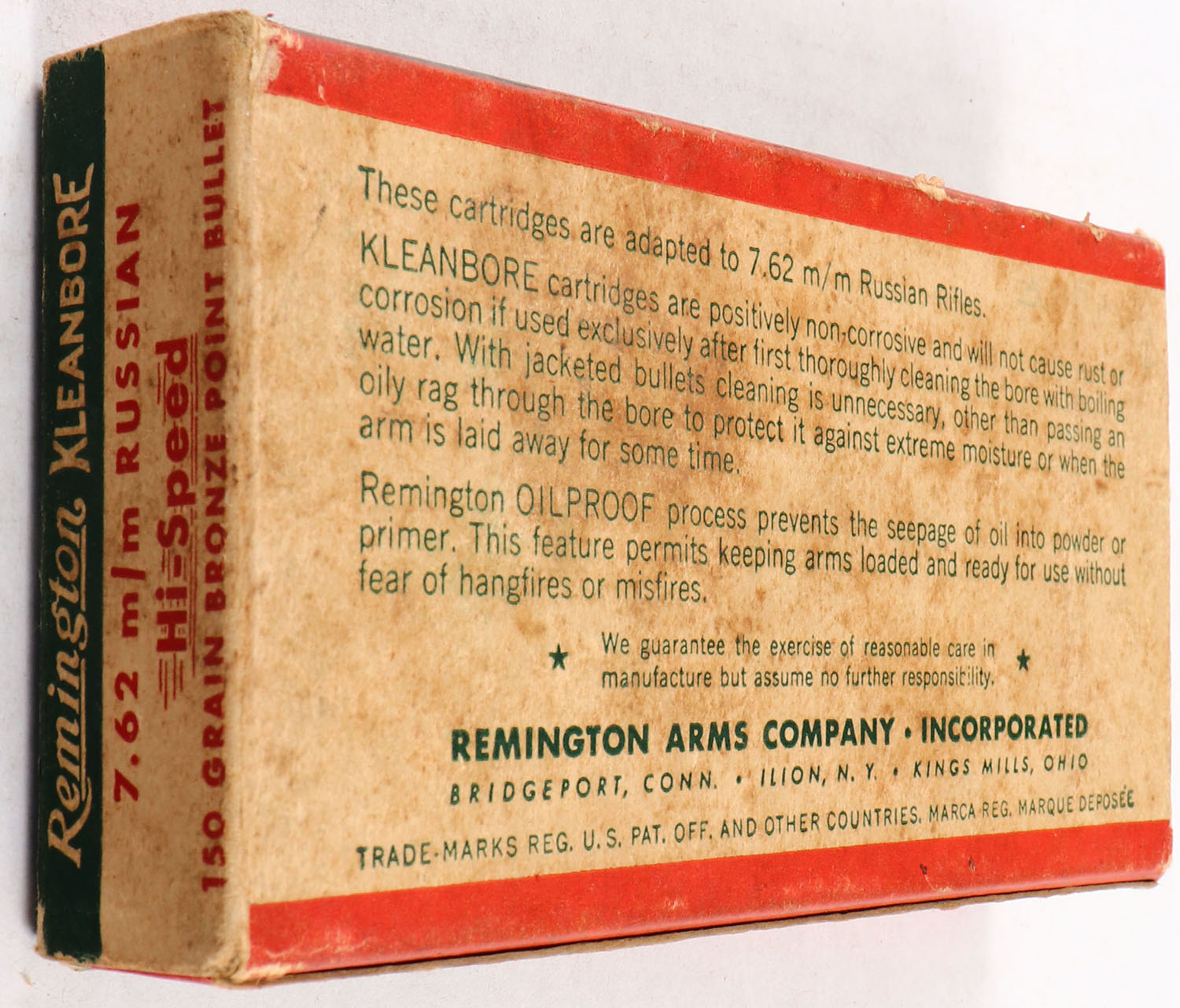 Remington, Kleanbore, 7.62mm Russian, 150Gr Bronze Pointed Bullet, For remington Russia rifle & other arms, 1pc, Full, Green White & red box, box is solid with light age soiling, edge wear & light rub marks, ammo is excellent. Grade: Very Good + - Value: 20 to 60