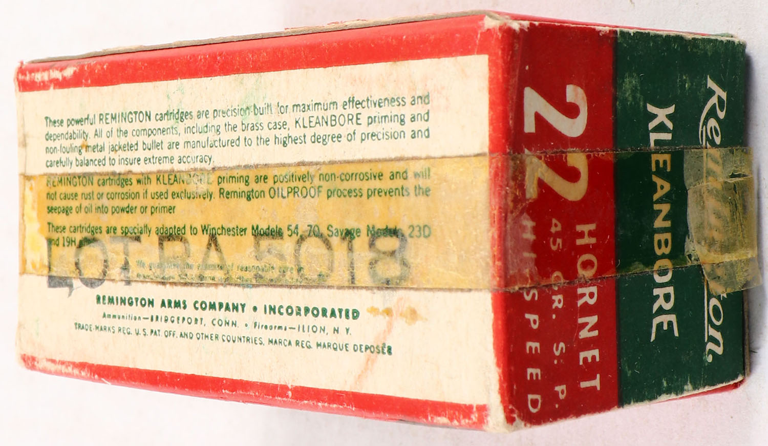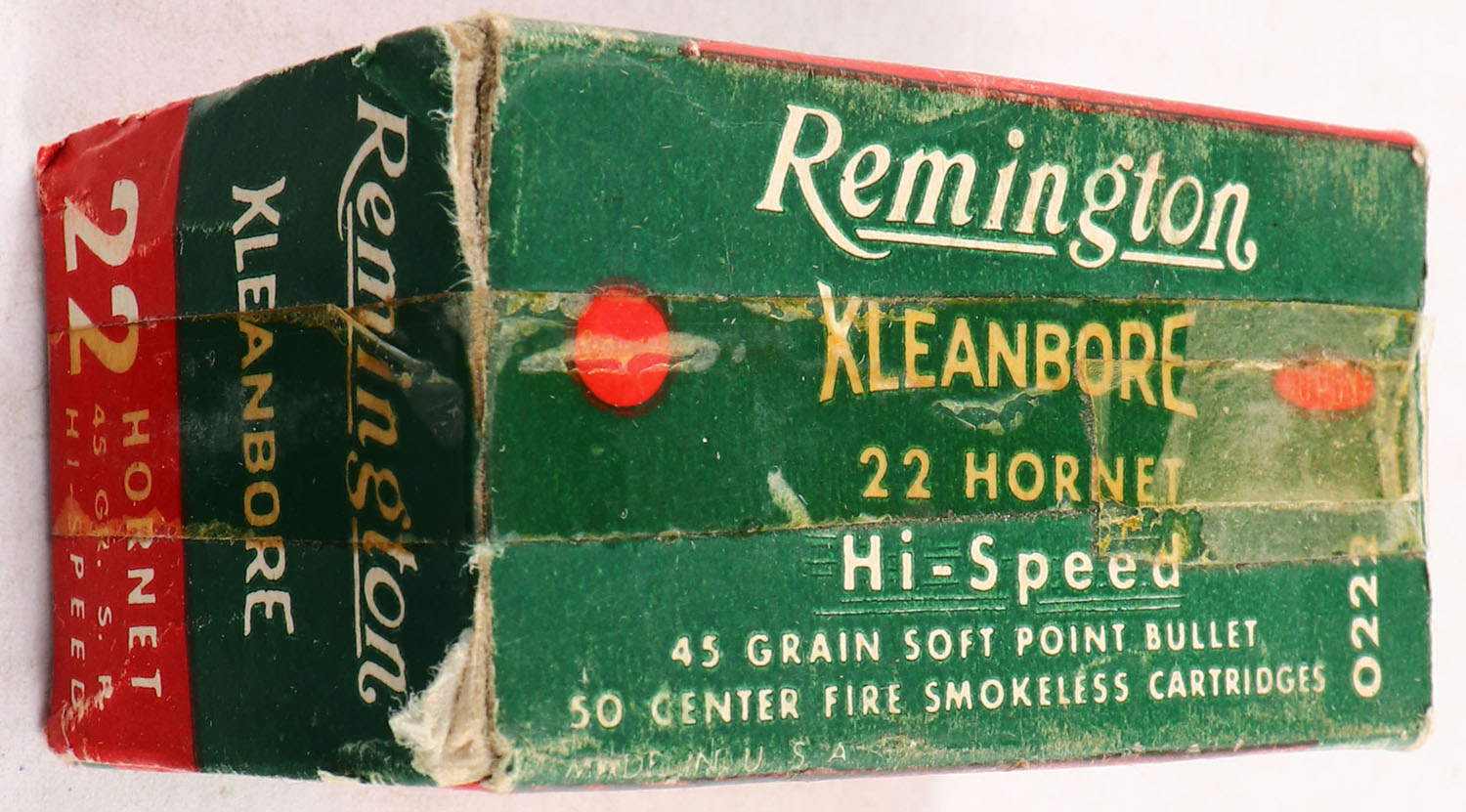 Remington, Kleanbore Hi-Speed, .22 Hornet, 45 Grain Soft Point Bullet, Full, 1pc. Green white & red box, box is solid with excellent color, minor shelf wear, box is wrapped in tape, minor edge & corner wear, end flaps are solid, ammo is excellent. Grade: Very Good - Value: 20 to 60