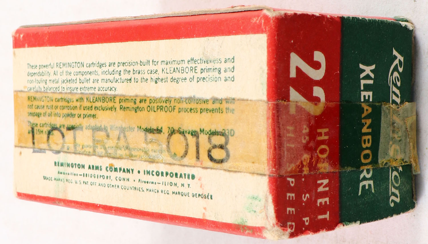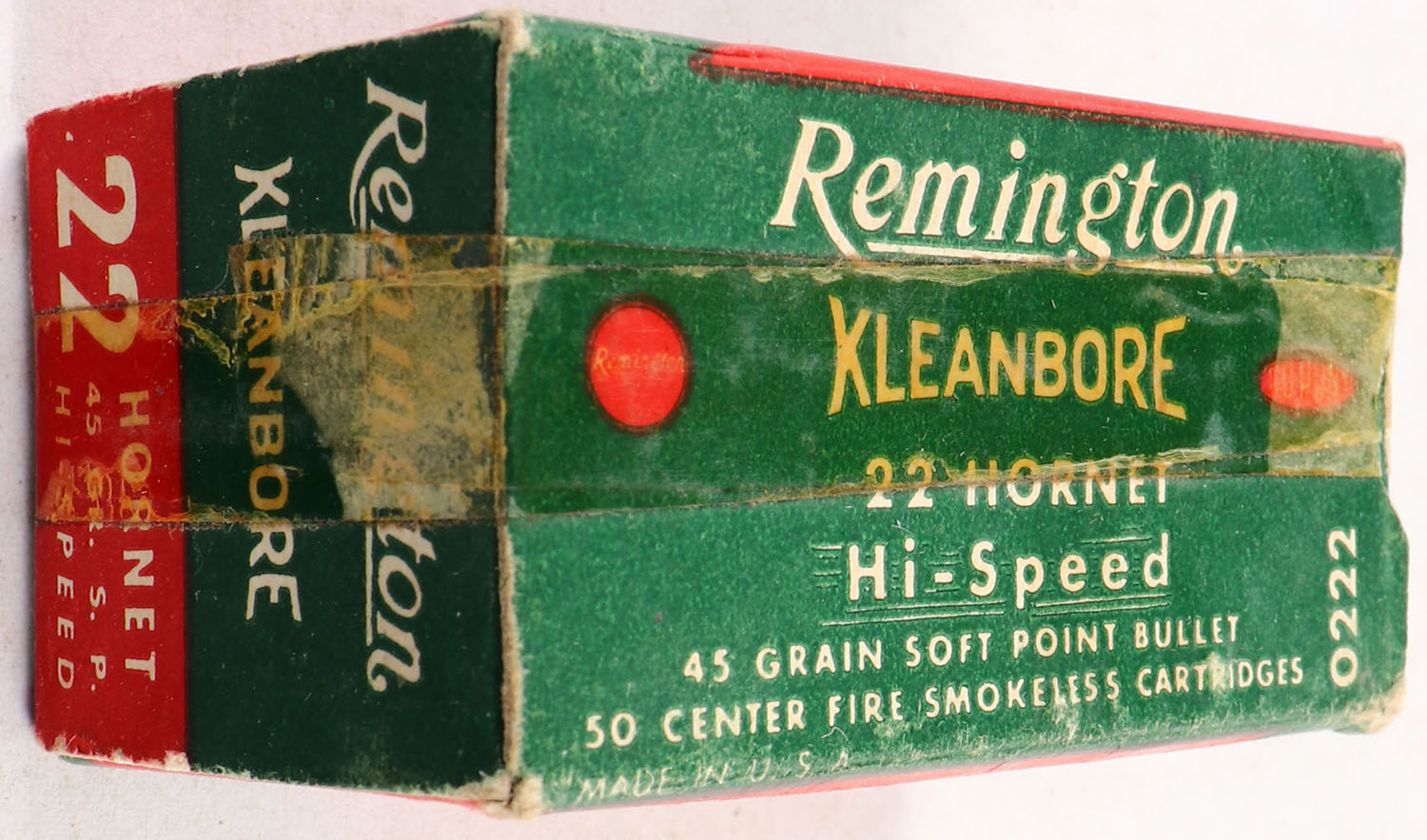 Remington, Kleanbore Hi-Speed, .22 Hornet, 45 Grain Soft Point Bullet, Full, 1pc. Green white & red box, box is solid with excellent color, minor shelf wear, box is wrapped in tape, minor edge & corner wear, end flaps are solid, ammo is excellent. Grade: Very Good - Value: 20 to 60