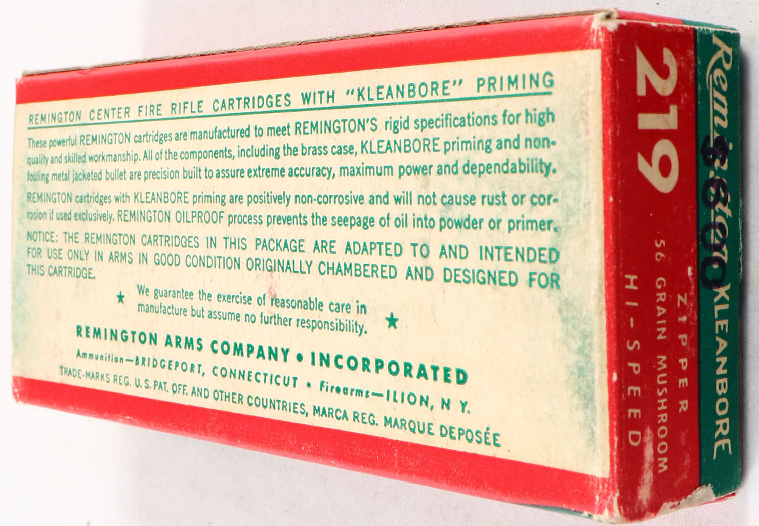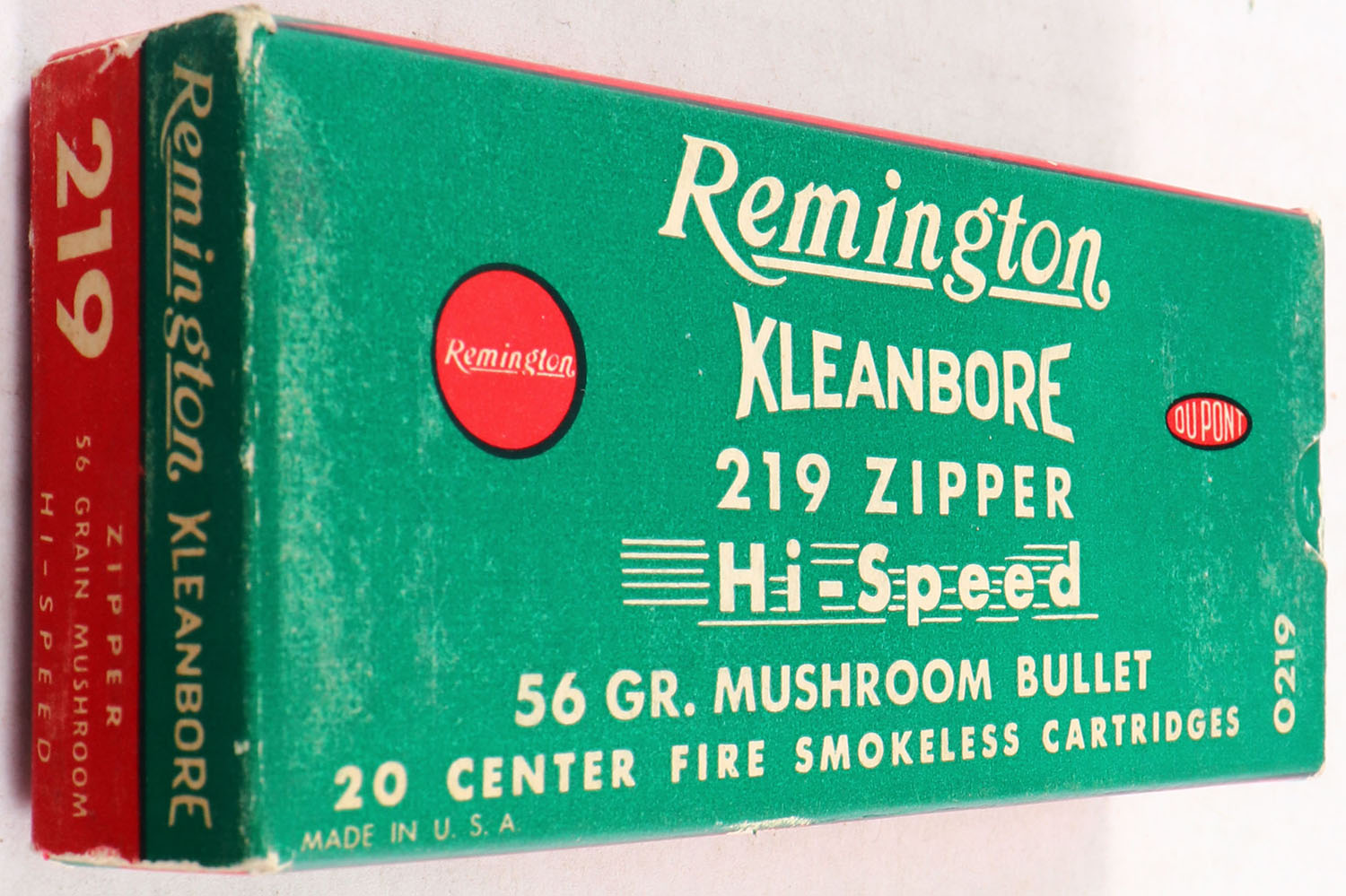 Remington, Kleanbore Hi-Speed, .219 Zipper, 56 Grain Mushroom Bullet, Full, 1pc. Green white & red box, box is solid with excellent color, some shelf & corner wear, very minor edge wear, end flaps are solid, ammo is minty. Grade: Excellent - Value: 100 to 200