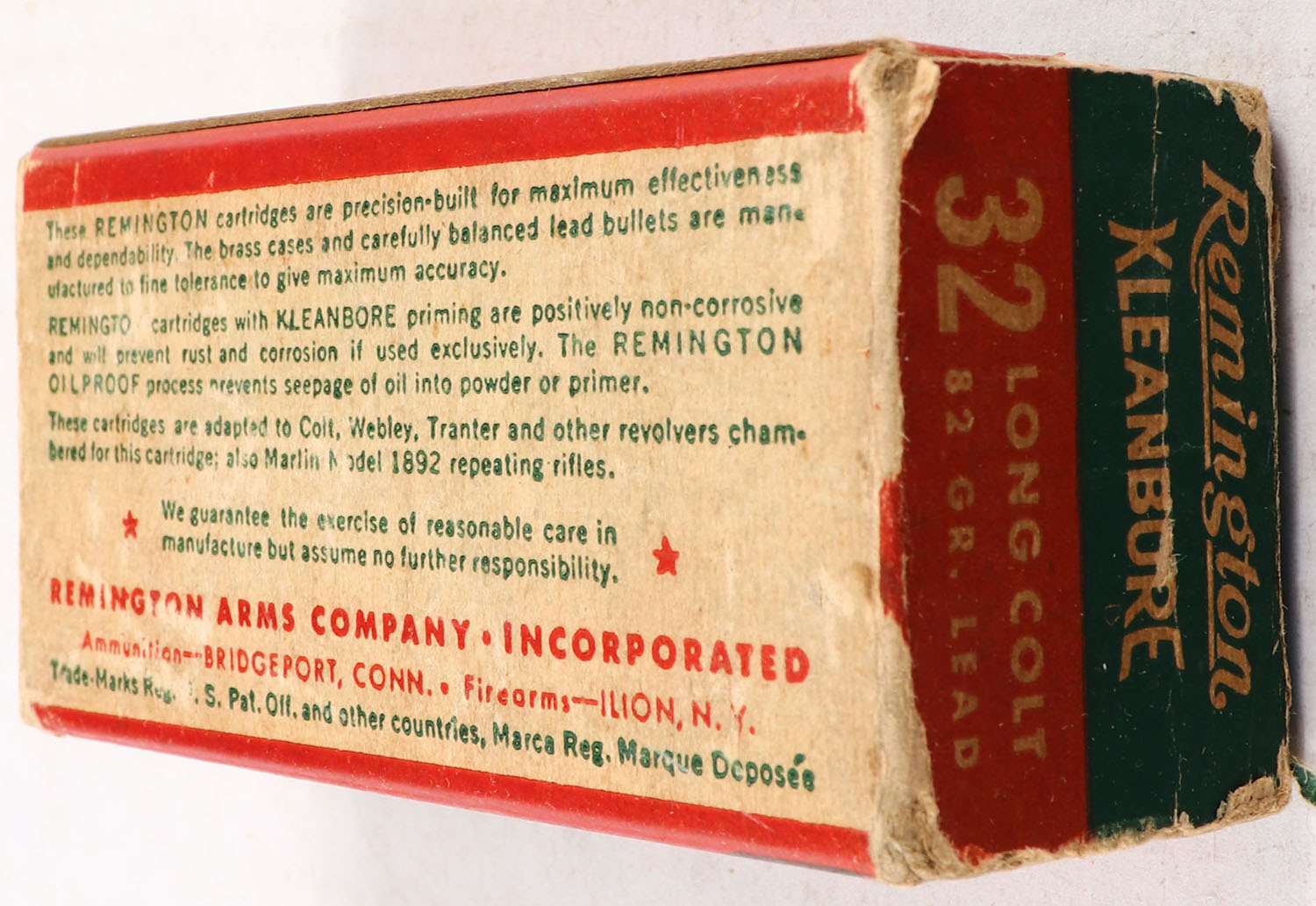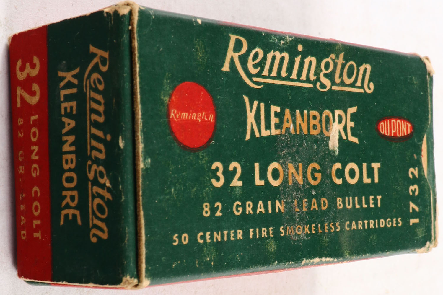 Remington, Kleanbore, .32 Long COLT, 82 Gr. Lead Bullet, 1pc, FULL, green, red and white box, box is solid with great color, has shelf wear with some corner wear, ammo is minty. Grade: Very Good + - Value: 40 to 100