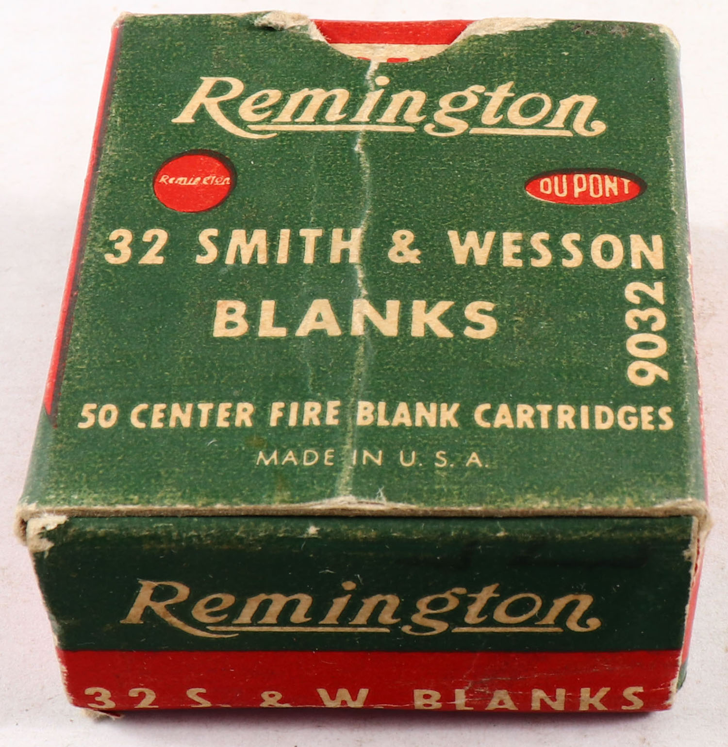 Remington, .32 Smith & Wesson Blanks, Extra Loud Report, Full, 1pc. Green red & white box, box is solid with excellent color, minor corner wear, edges are mostly crisp, end flaps are solid, ammo is excellent. Grade: Very Good ++ - Value: 8 to 30