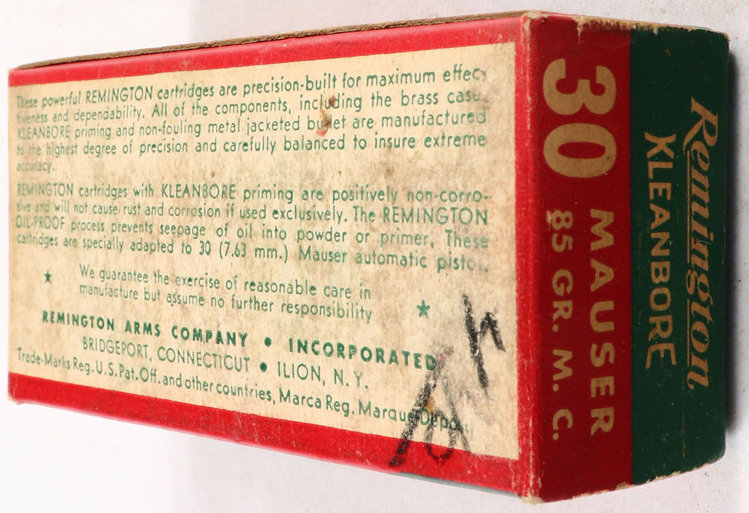 Remington, Kleanbore, .30 Mauser (7.63mm), 85 Grain Metal Cased Bullet, Full, 1pc. Green white & red box, box is solid with very good color, very minor age soiling, very minor corner wear, edges are crisp, end flaps are solid, ammo is excellent. Grade: Excellent - Value: 20 to 60