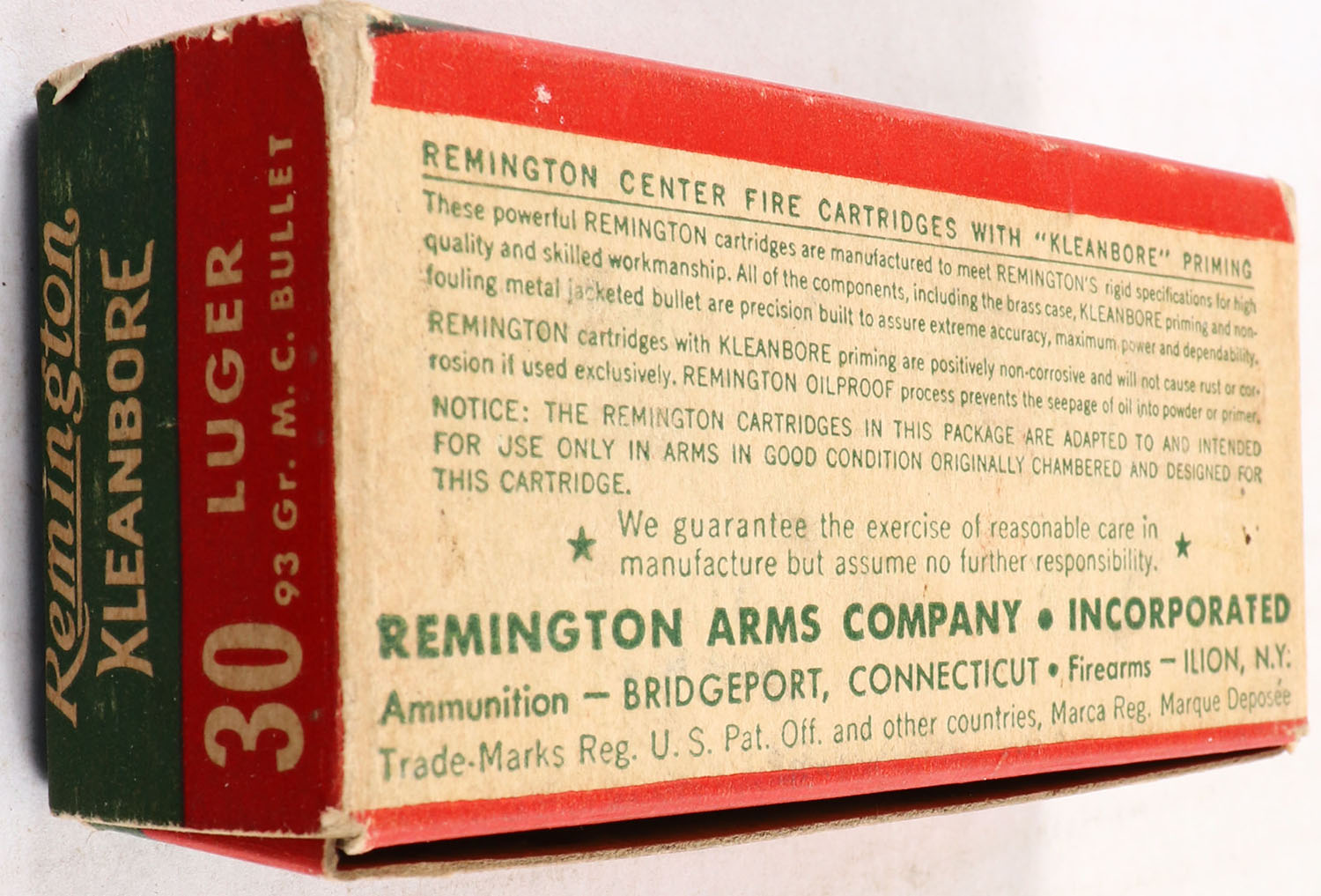 Remington, Kleanbore, .30 Luger (7.65mm), 93 Grain Metal Case Bullet, Full, 1pc. Green white & red box, box is solid with good to very good color, box has minor shelf & corner wear, edges are mostly crisp, has writing to top, end flaps are solid, ammo is excellent. Grade: Very Good ++ - Value: 30 to 90