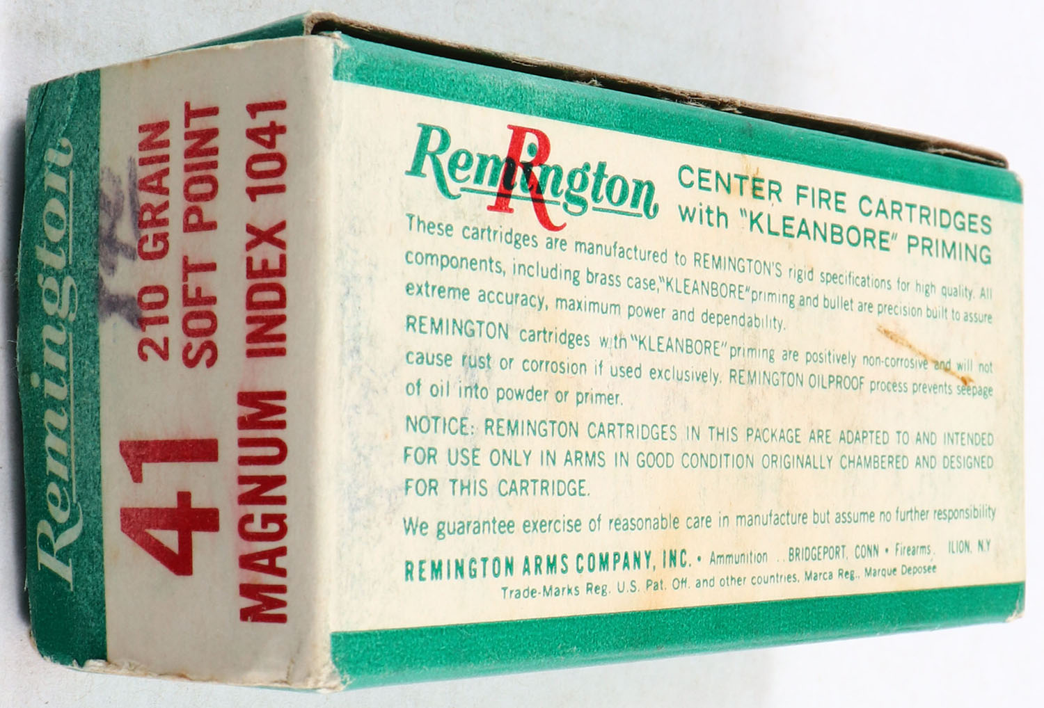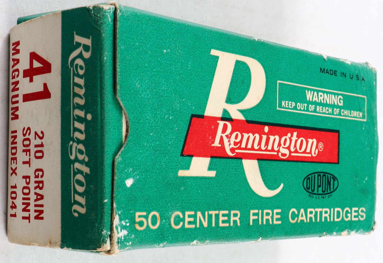 Remington, .41 Magnum, 210 Gr. Soft Point, 1pc, Full, green box with red/white print, box is solid with great colors, has corner wear with shelf wear, ammo is minty. Grade: Excellent + - Value: 40 to 150