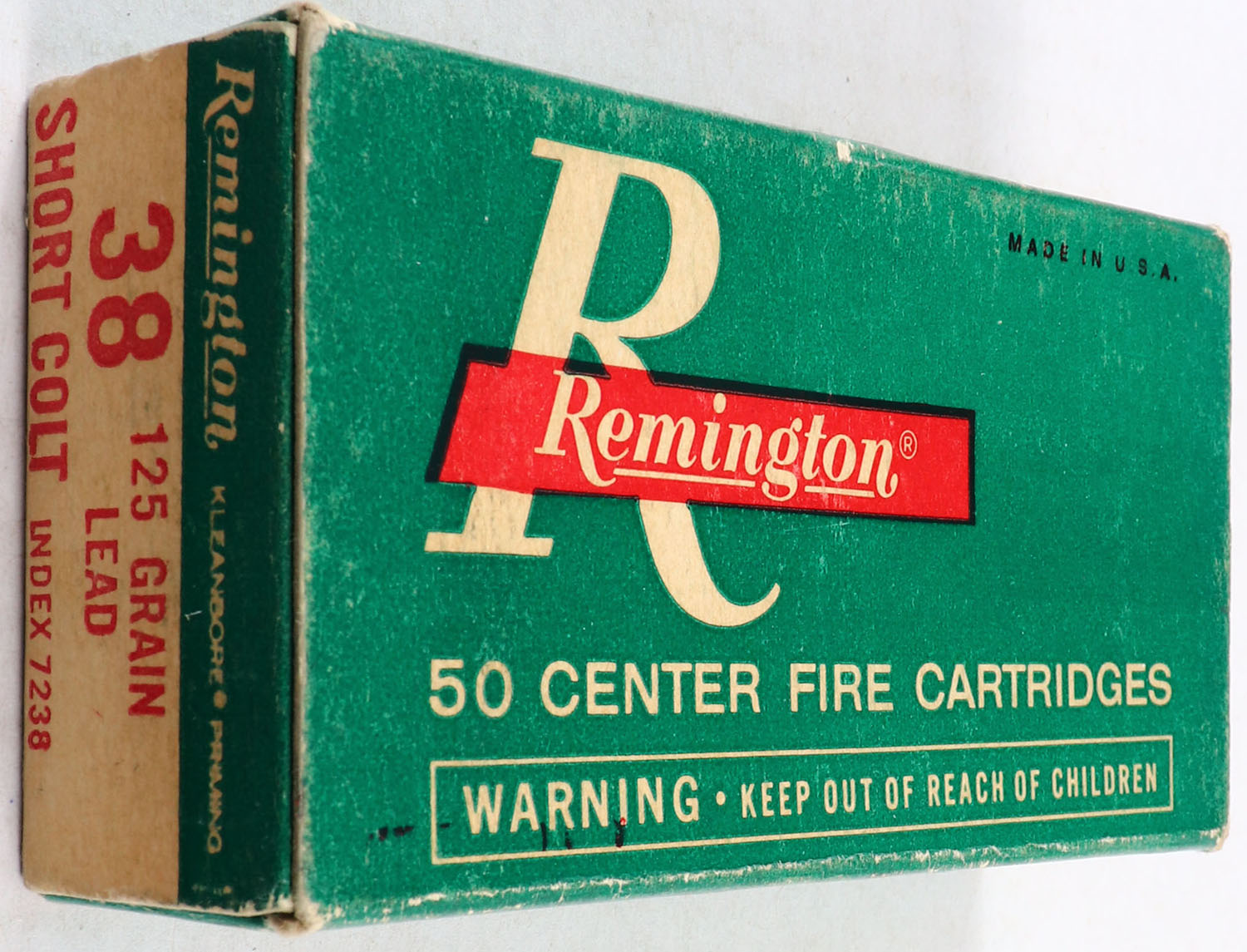Remington, .38 Short Colt, 125 Gr. Lead Bullet, 1pc, Full, Green & white box with red & white print, box is solid with rub marks, ammo is excellent. Grade: Very Good ++ - Value: 40 to 80