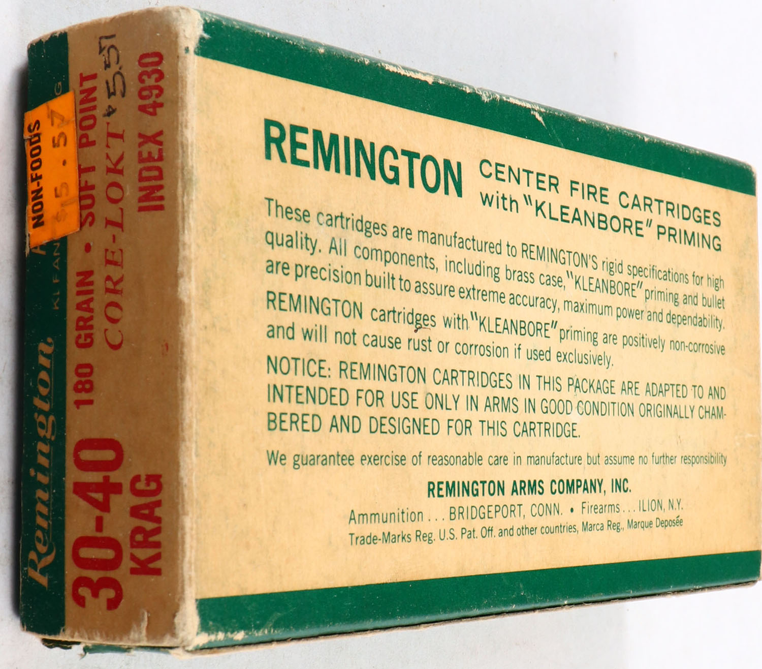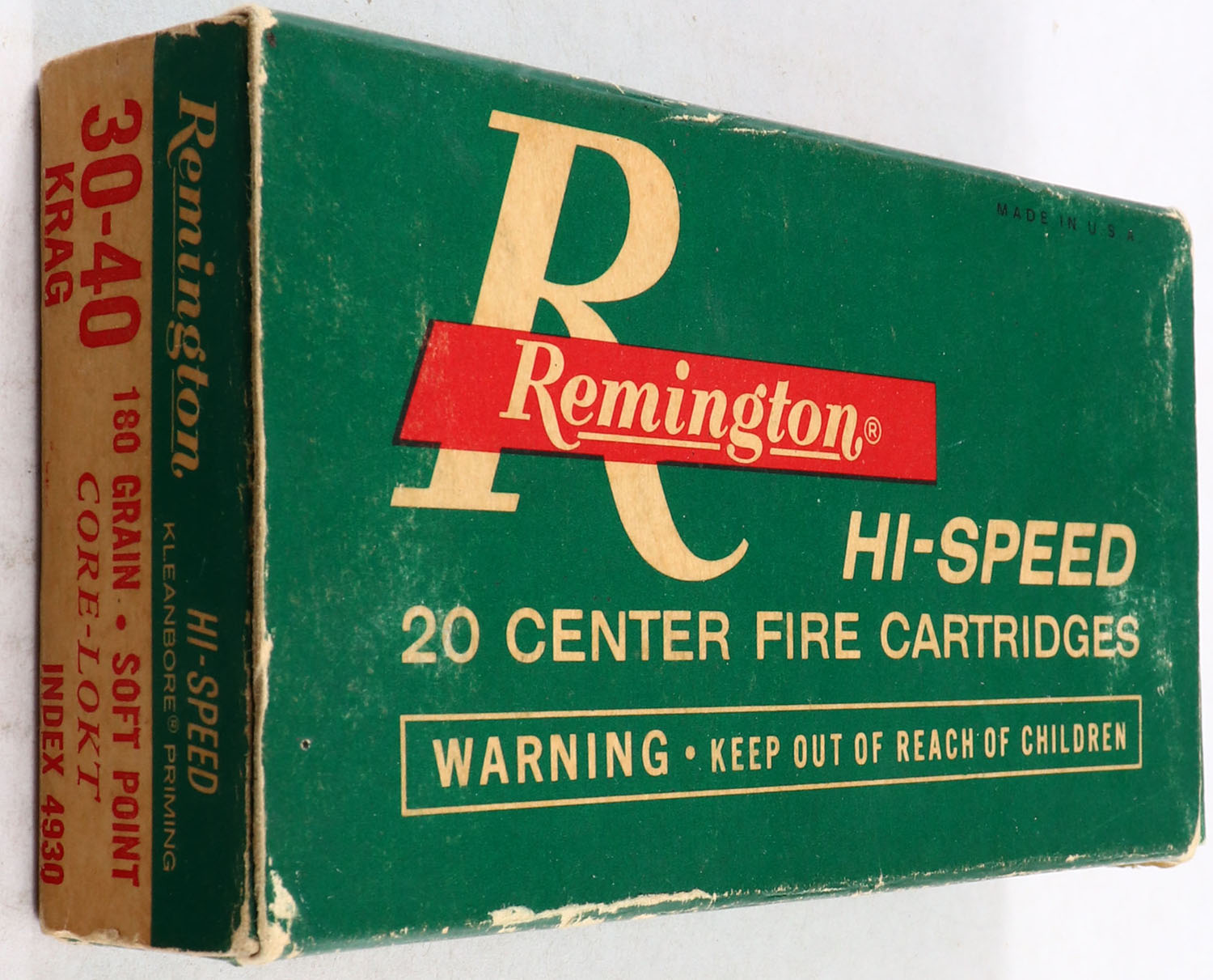 Remington, .30-40 Krag Hi-Speed, 180 Gr. Soft point Core-Lokt Bullet, 1pc, Full of mixed H.S., Green white box with red & white print, box is solid with rub marks, ammo is good. Grade: Very Good ++ - Value: 20 to 60