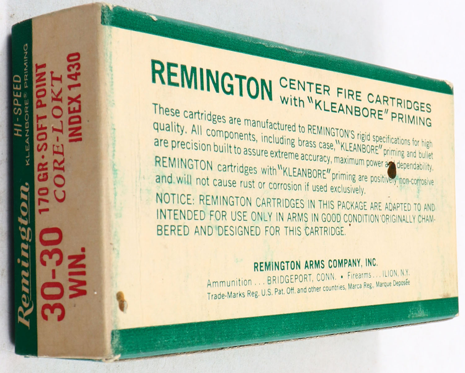 Remington, Hi-Speed, .30-30 Winchester, 170 Grain Soft Point Core-Lokt, Full, 1pc. Green white & red box, box is solid with excellent color, minor age soiling, corners are mostly sharp, edges are crisp, end flaps are solid, ammo is excellent. Grade: Excellent + - Value: 20 to 60