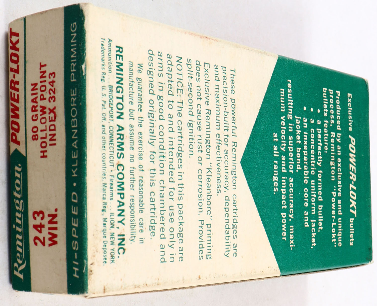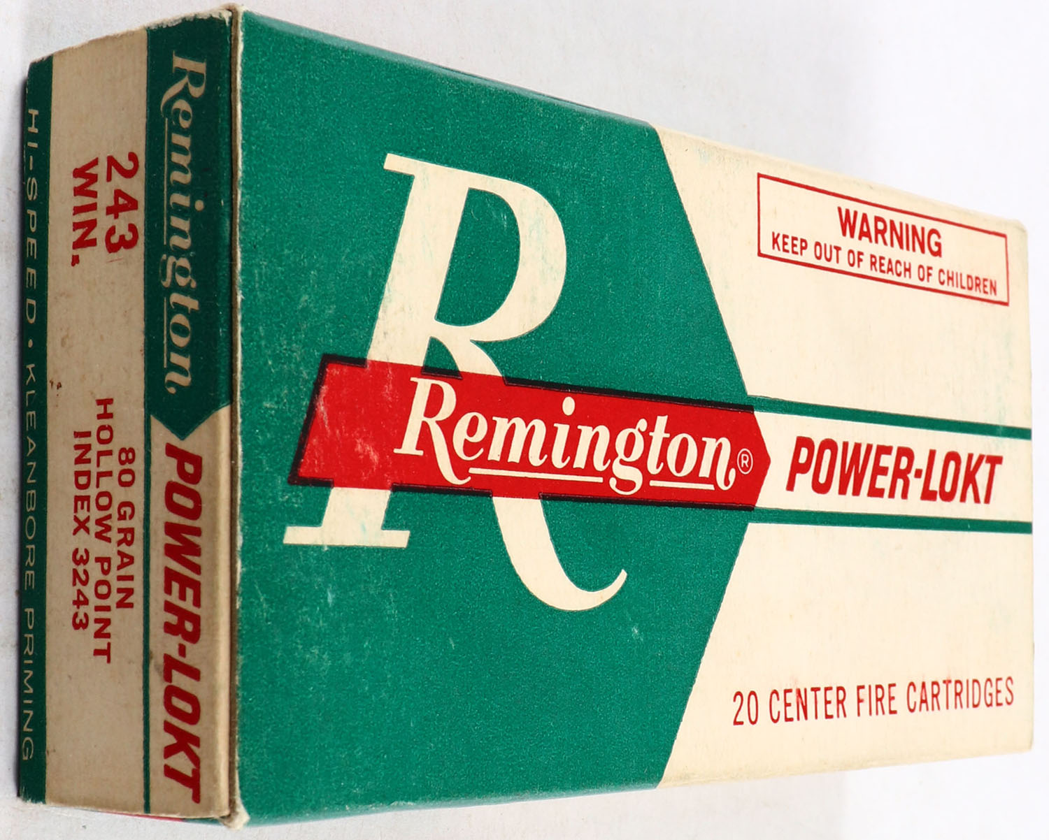 Remington, Power-Lokt, 243 Winchester, 80 Grain, Hollow Point, Full, 1pc. Green & white box, box is solid with very good color, end flaps are solid, ammo is excellent. Grade: Excellent + - Value: 20 to 60