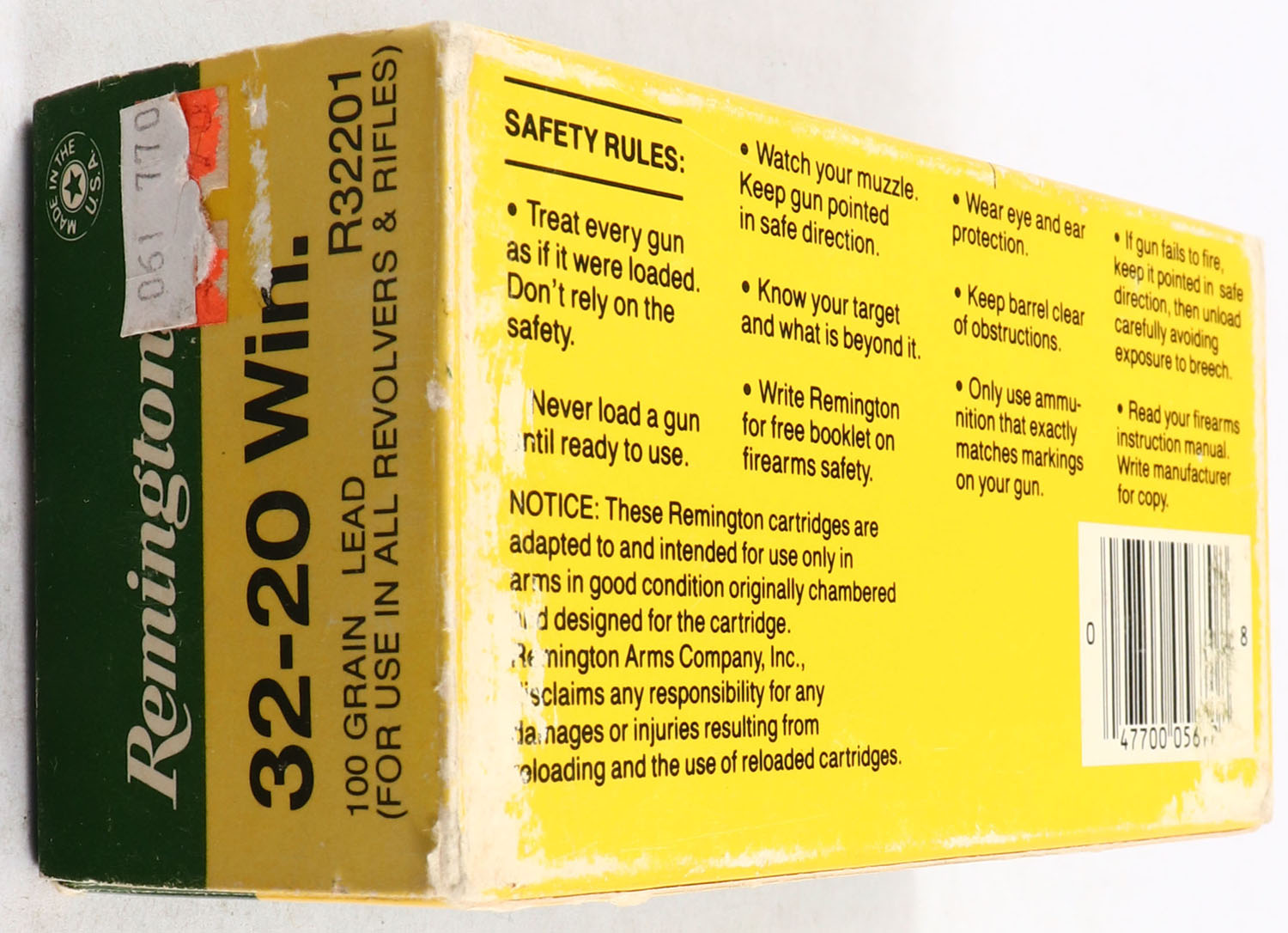 Remington, High Velocity, 32-20 Winchester, 100 Grain Lead, Full, 1pc. Green & yellow box, box is solid with good color, shelf wear, edge & corner wear, end flaps are solid, sticker on right end, ammo is excellent. Grade: Very Good ++ - Value: 50 to 150