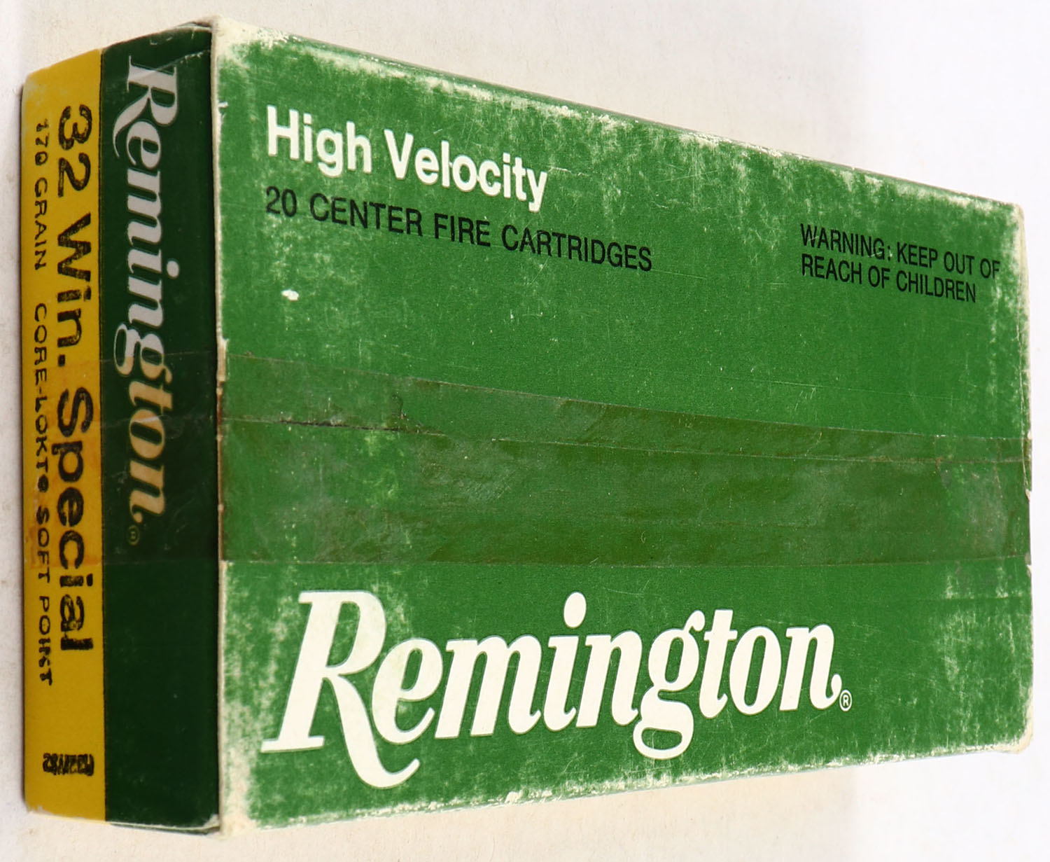Remington, High Velocity, 32 Win Special, 170 Grain Soft Point, Full, 1pc. Yellow, green, white & black box, box is solid with great color, box has age soiling & light scuffing, end flaps are solid, ammo is excellent. Grade: Excellent - Value: 10 to 50