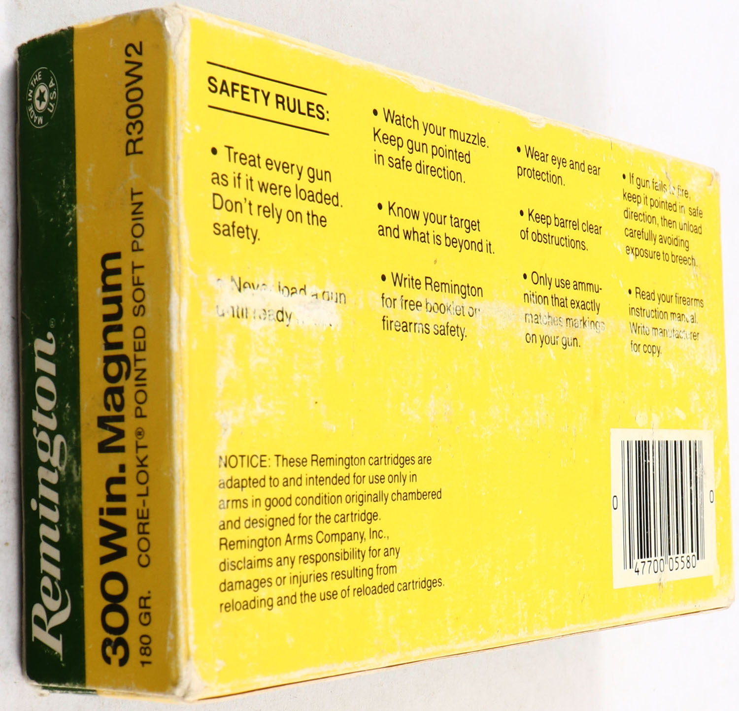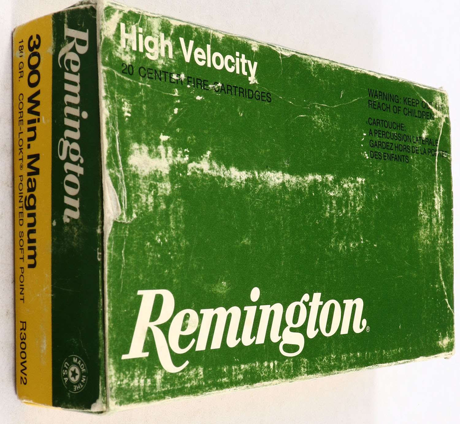 Remington, High Velocity, .300 Win. Magnum, 180 Grain Core-Lokt Pointed Soft Point, Full of mixed H.S., 1pc. Green yellow & white box, box is solid with very good color, shelf wear, corner wear, some edge wear, end flaps are solid, ammo is excellent. Grade: Very Good - Value: 20 to 40