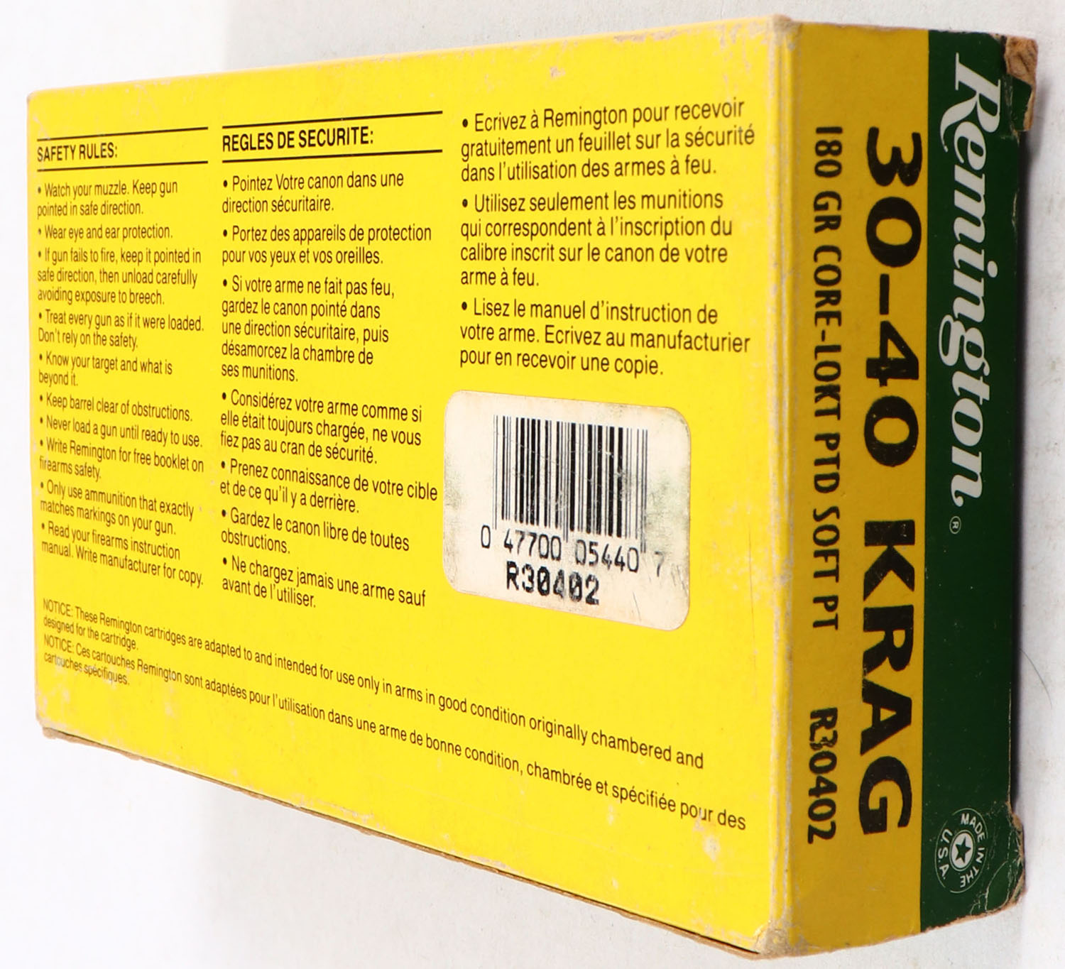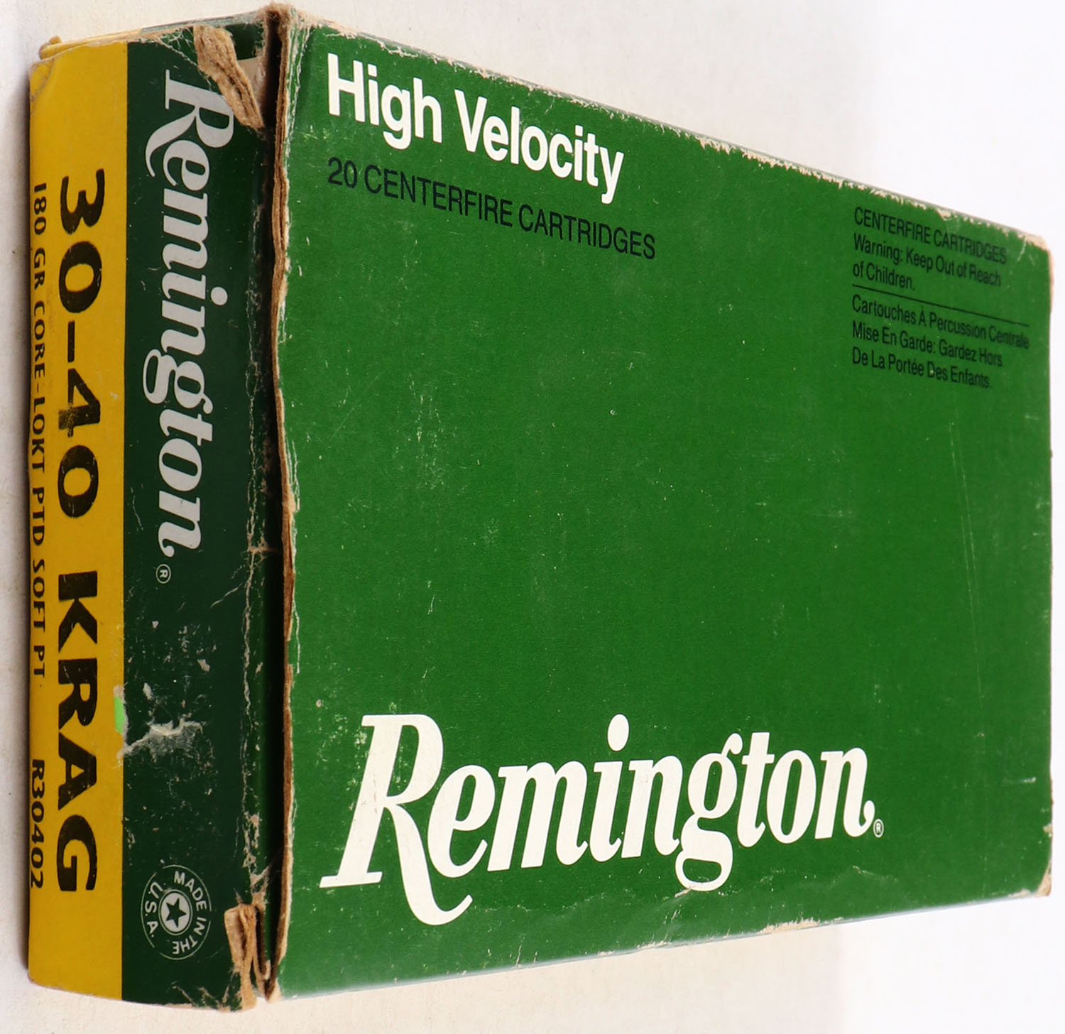 Remington, High Velocity, 30-40 Krag, 180 Grain Core-Lokt PTD Soft Point, Full 1pc, Green & yellow box, box is solid with good color, shelf wear, edge & corner wear, end flaps are solid, ammo is excellent. Grade: Very Good ++ - Value: 20 to 60