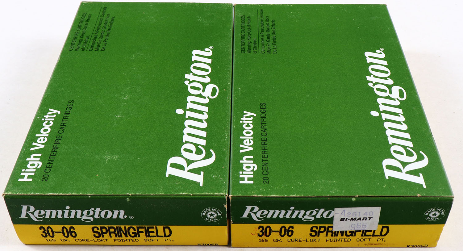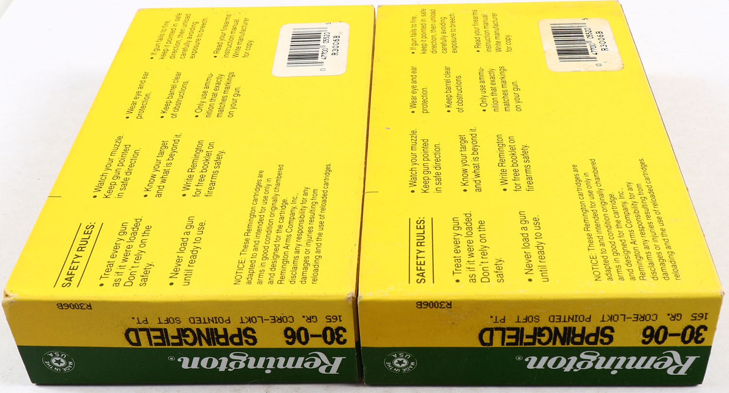 Remington, Lot of 2, High Velocity, .30-06 Springfield, 165 Grain Core-Lokt Pointed Soft Point, Full, 1pc. Green yellow & white box, box is solid with excellent color, end flaps are solid, ammo is excellent. Grade: Excellent + - Value: 20 to 80