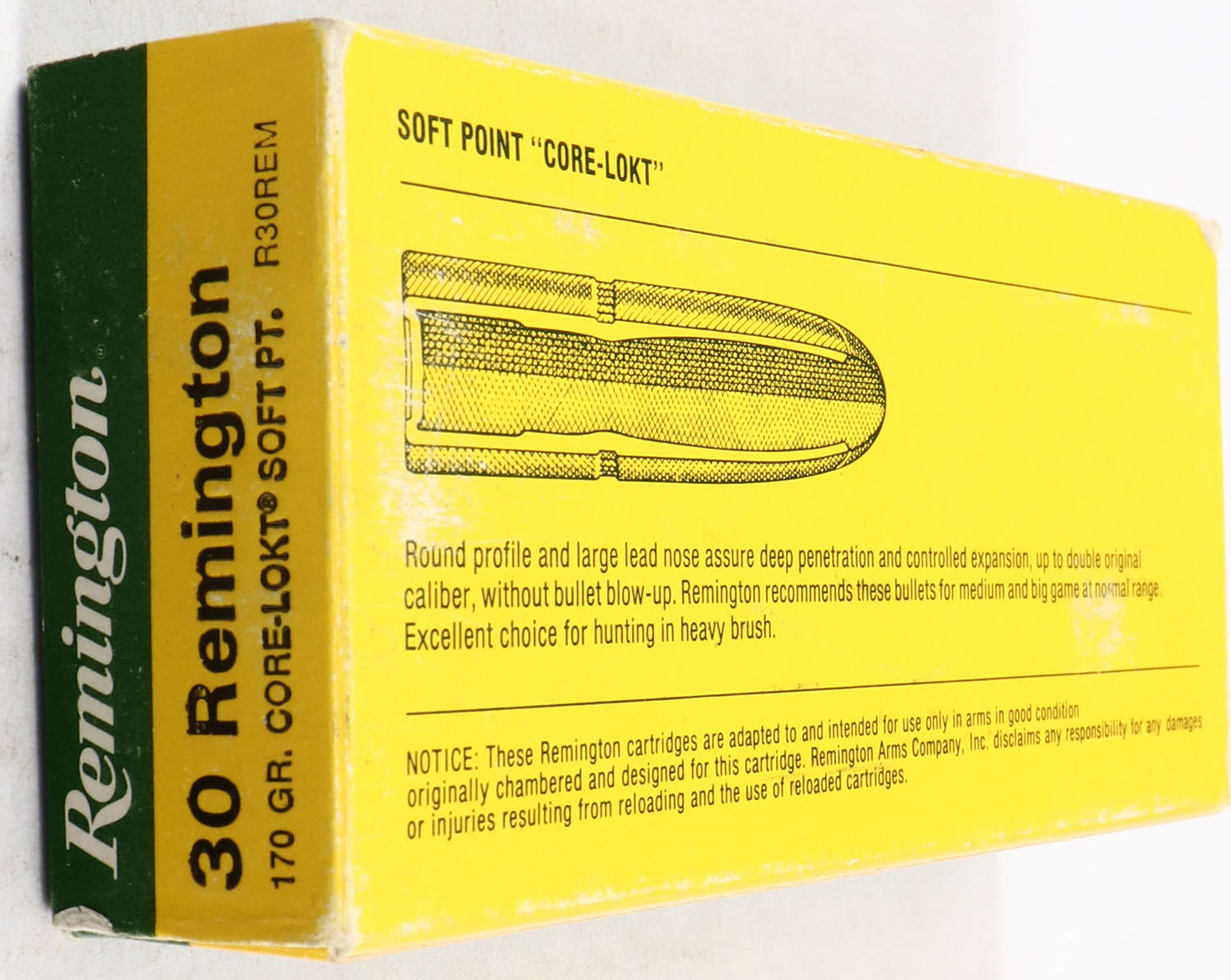 Remington, High Velocity, .30 Remington, 170 Gr. Soft Point Core-Lokt Bullet, 1pc, Full, green/yellow box with white/black print, box is solid with rub marks, ammo is excellent. Grade: Excellent - Value: 30 to 60