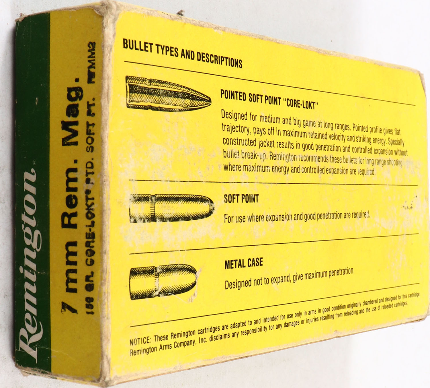 Remington, High Velocity, 7mm Rem Mag, 150 Grain Core-Lokt Pointed Soft Point, Full, 1pc. Yellow, green, white & black box, box has soiling, shelf wear, edge & corner wear, end flaps are solid, ammo is very good. Grade: Good ++ - Value: 10 to 50