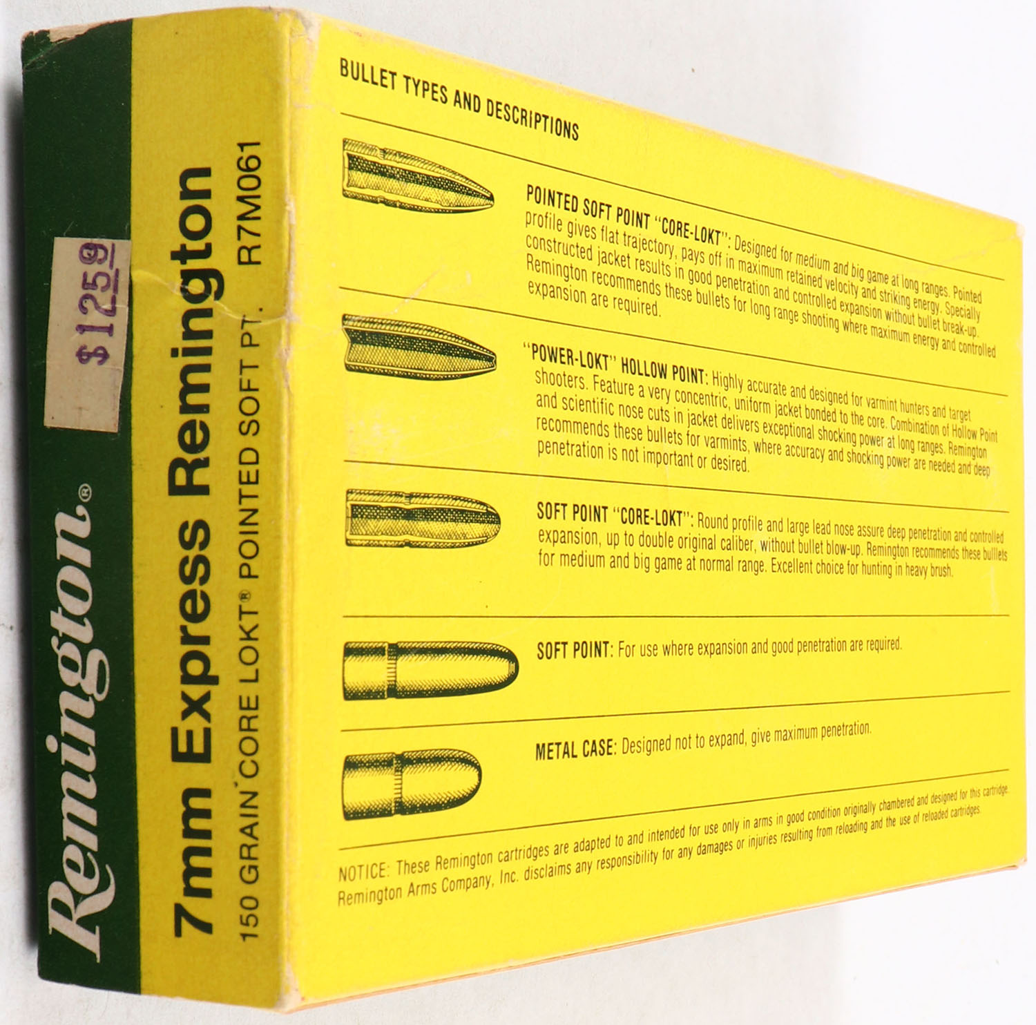 Remington, High Velocity, 7mm Express Remington, 150 Gr. Core-Lokt Pointed Soft P.T. bullet, 1pc, Full, green/yellow box with white/black print, box is solid with minor rub marks & minor corner wear, ammo is very good. Grade: Excellent - Value: 30 to 60