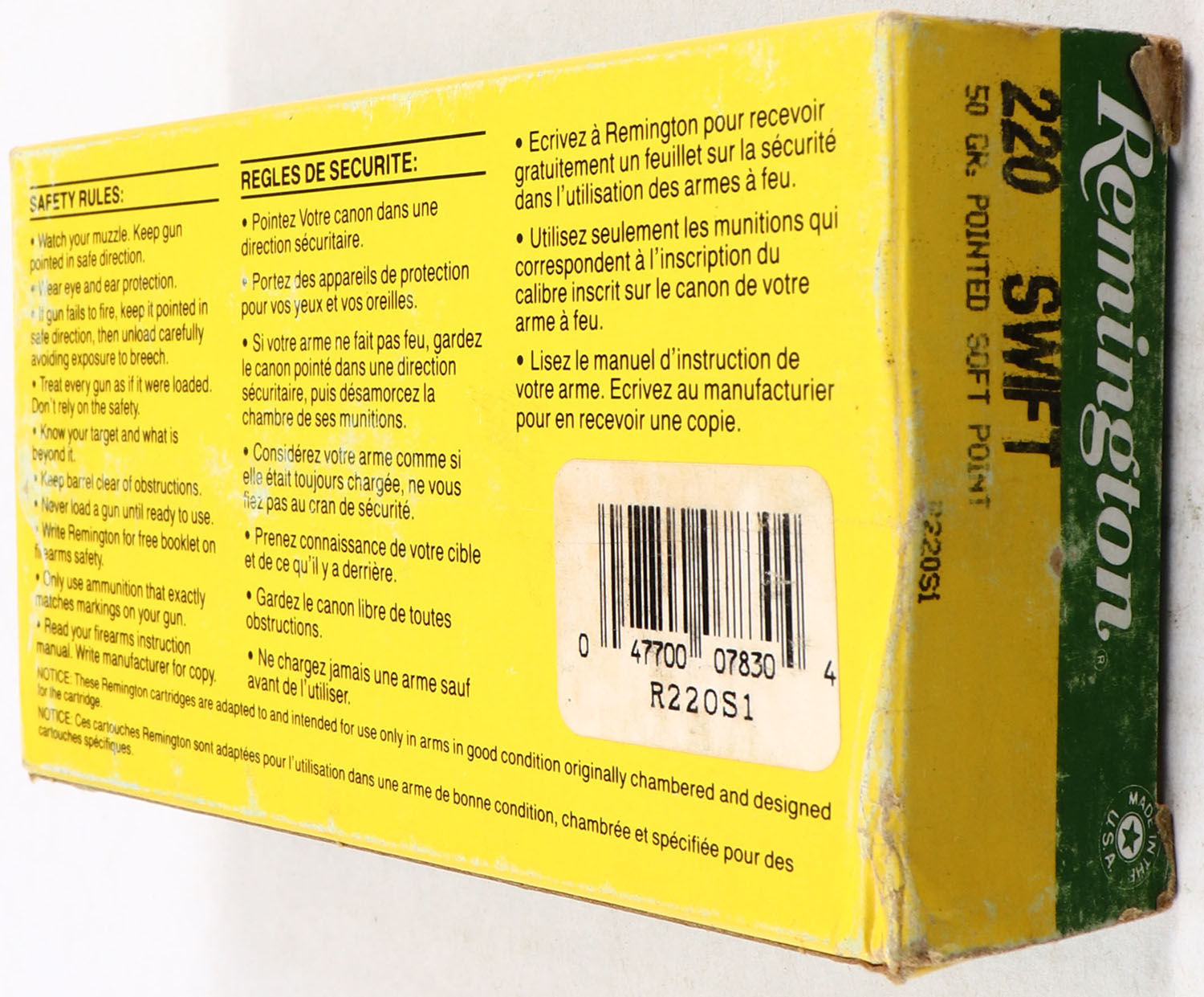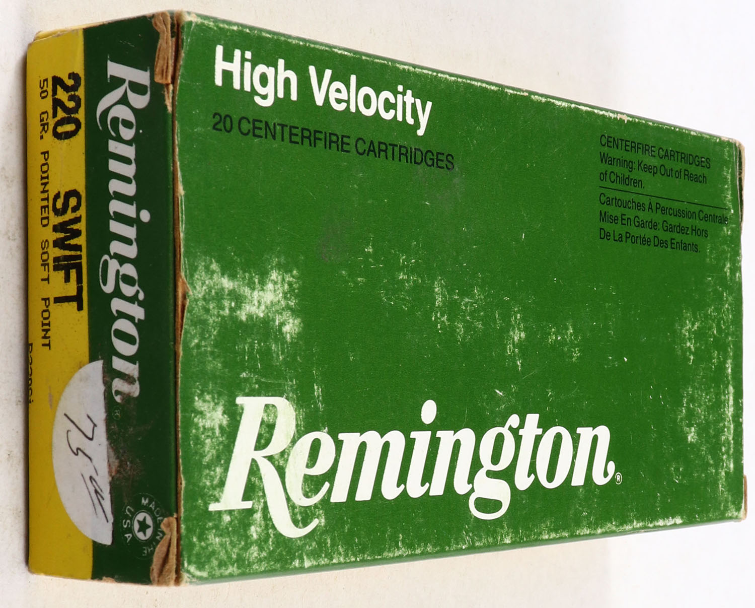 Remington, High Velocity, 220 Swift, 50 Gr. Soft Point, Full, 1pc. Yellow, green, white & black box, box is solid with light scuffing, end flaps are solid, ammo is excellent. Grade: Very Good + - Value: 30 to 90