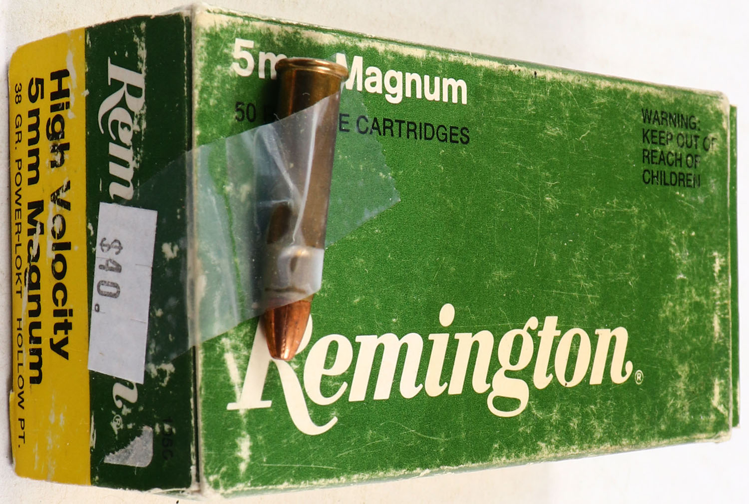 Remington, High Velocity, 5mm Magnum, 38 GR. Power-Lokt Hollow PT. Full, 1pc. Green, yellow & white box, box is solid with rub marks, minor edge & corner wear, has an extra Rd. taped on box, end flaps are solid, ammo is excellent. Grade: Excellent - Value: 30 to 60