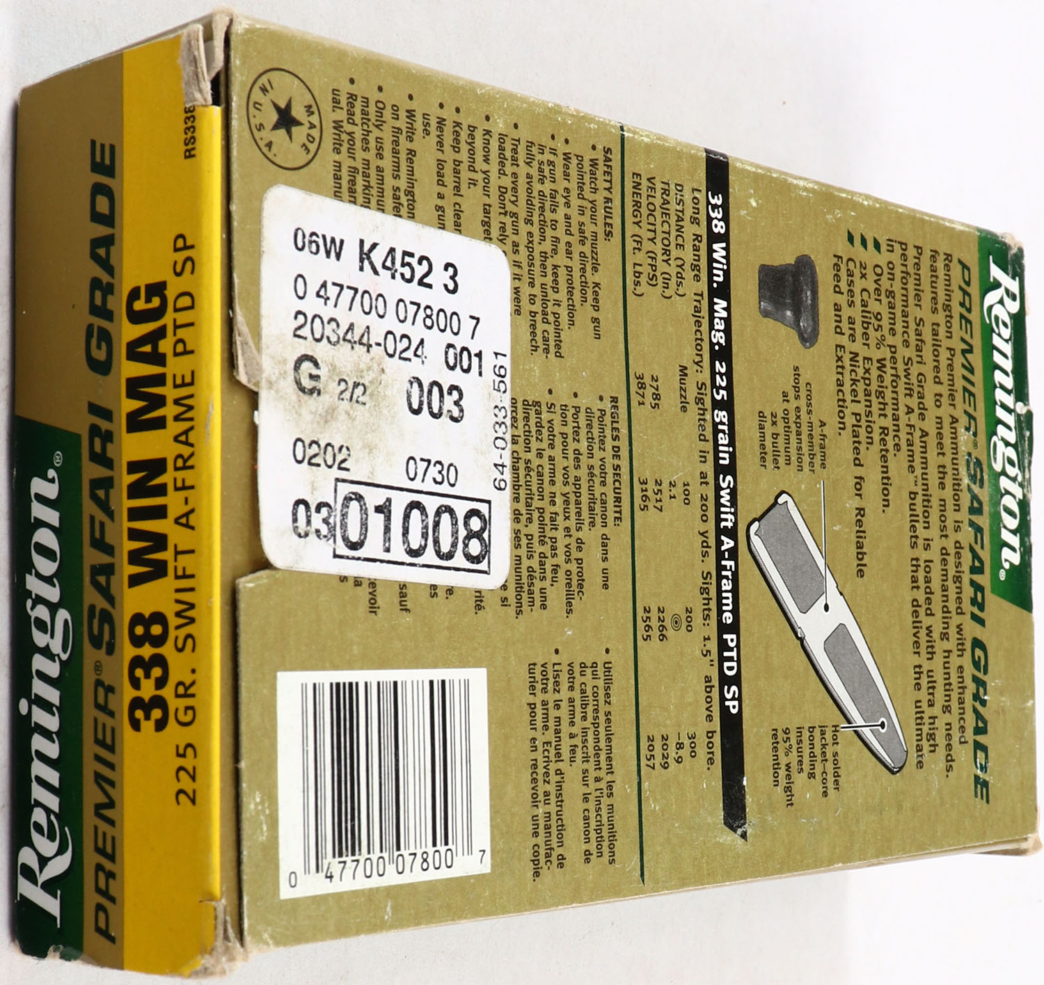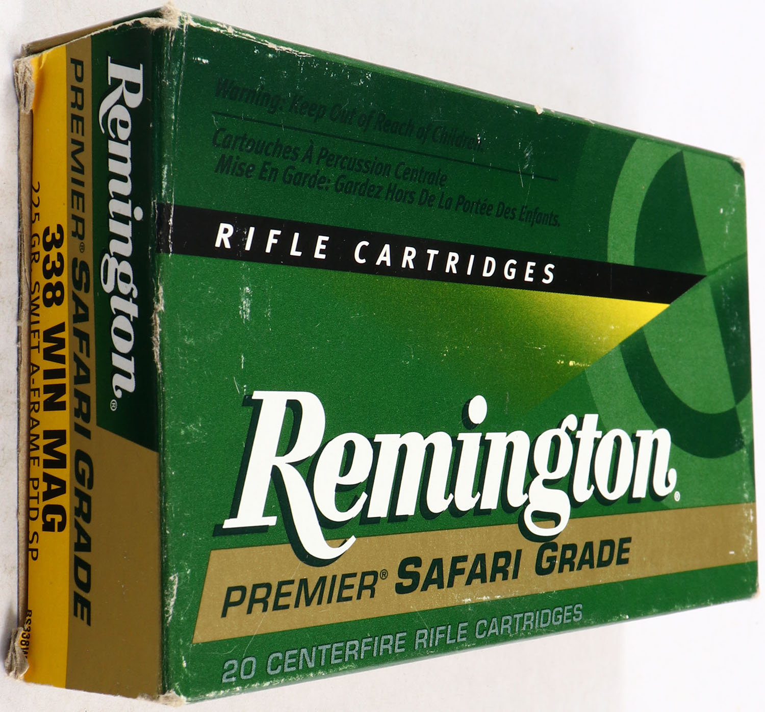 Remington, Premier Safari Grade, 338 Win Mag, 225 Grain Swift A-Frame PTD SP, Full, 1pc. Yellow, green, white & black box, box is solid with good color, end flaps are solid, minor corner wear, light shelf wear, ammo is minty. Grade: Very Good ++ - Value: 20 to 60