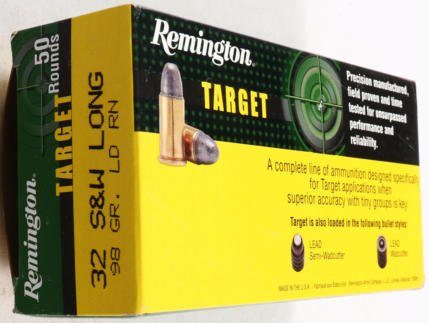 Remington Target, 32 S&W Long, 98 Grain, Lead Round Nose, Full, 1pc. Yellow, green & black box, box is solid with great color, minor edge & corner wear, end flaps are solid, ammo is excellent. Grade: Excellent + - Value: 20 to 80