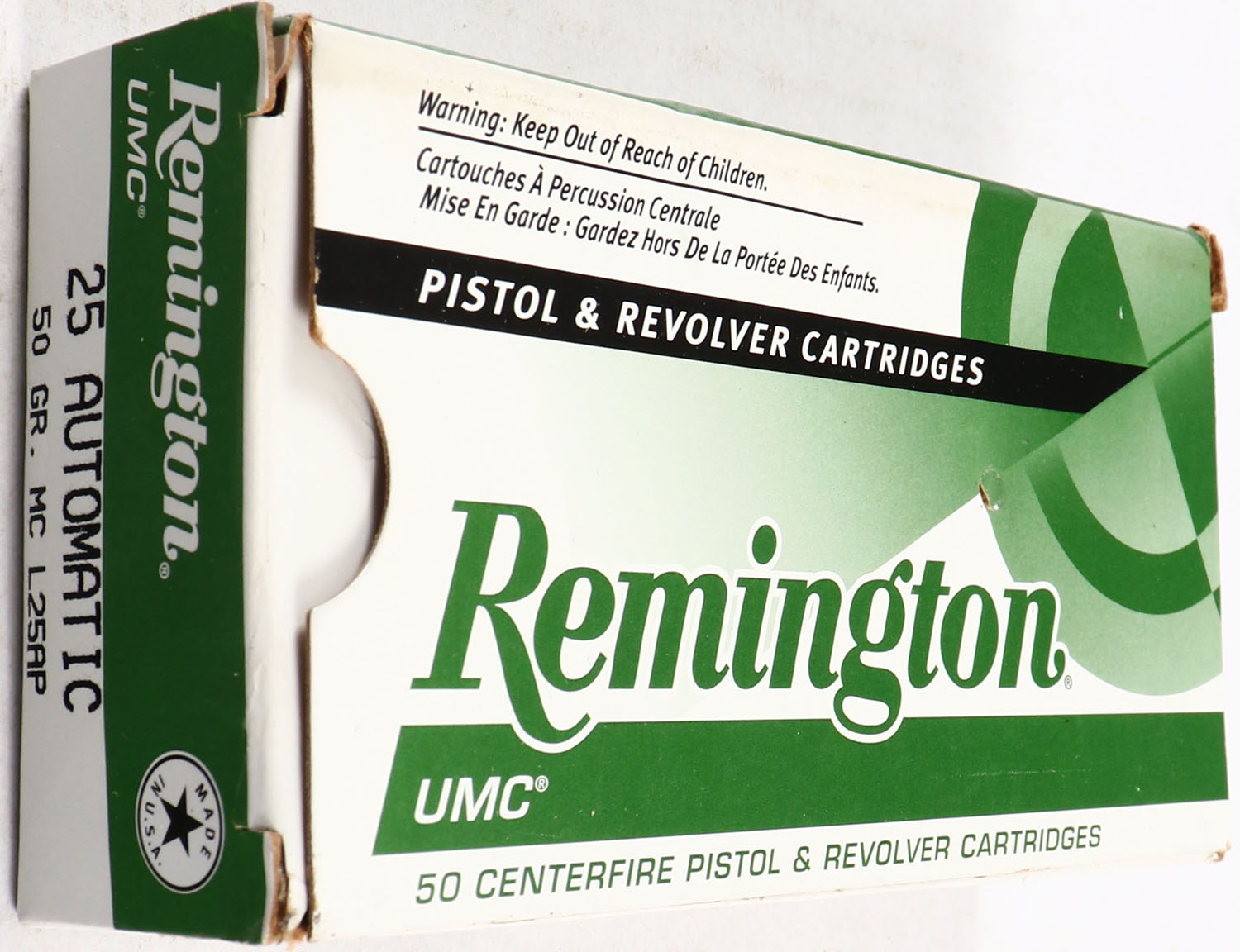 Remington, UMC, 25 Automatic, 50 Grain MC, Full, 1pc., Green, white & black box, box is solid with very nice color, right end flaps has tear, ammo is excellent. Grade: Very Good ++ - Value: 10 to 40