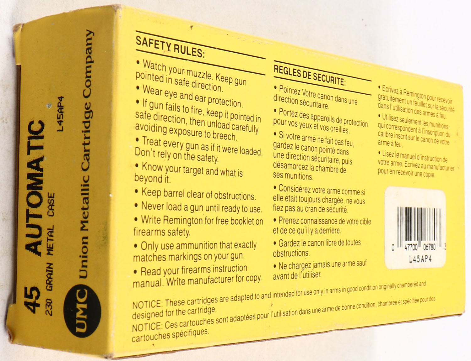 Remington, .45 Automatic, 230 Gr Metal Case, 1pc, Full, yellow box with black print, box is solid with sticker on bottom & light corner wear, ammo is excellent. Grade: Excellent + - Value: 30 to 90