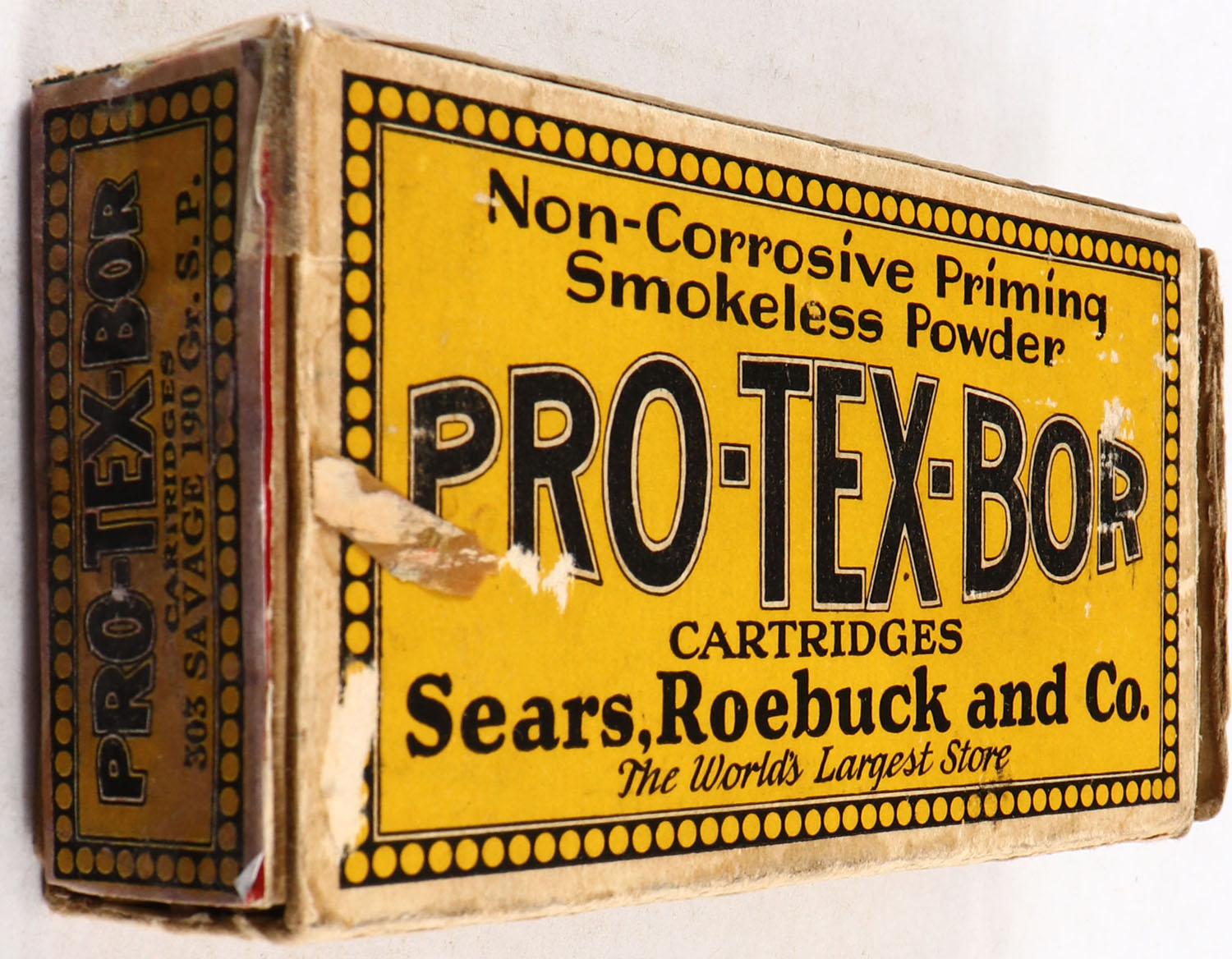 Sears, Pro-Tex-Bor, 303 Savage, 190 Gr. Soft Point, Full of Mixed H.S., 1pc. Yellow black & buff box, box has tape repairs to torn ends, light age soiling, has some edge & corner wear, ammo is good. Grade: Very Good - Value: 40 to 200