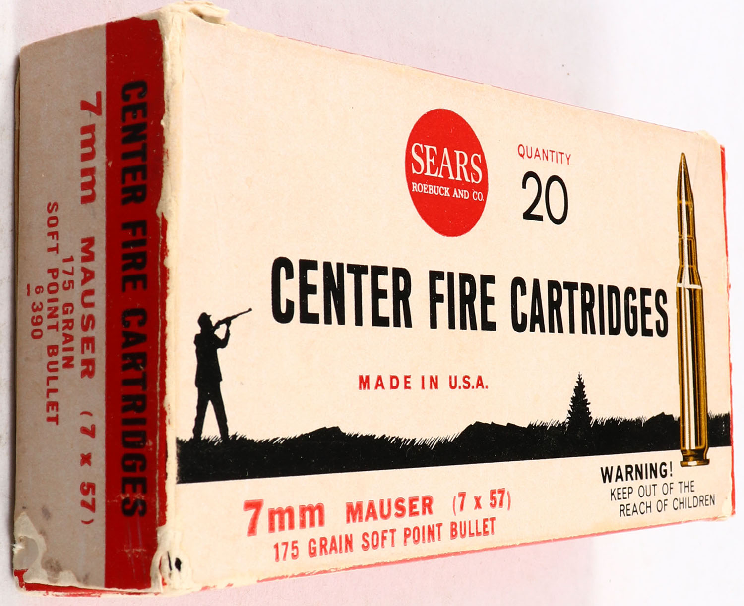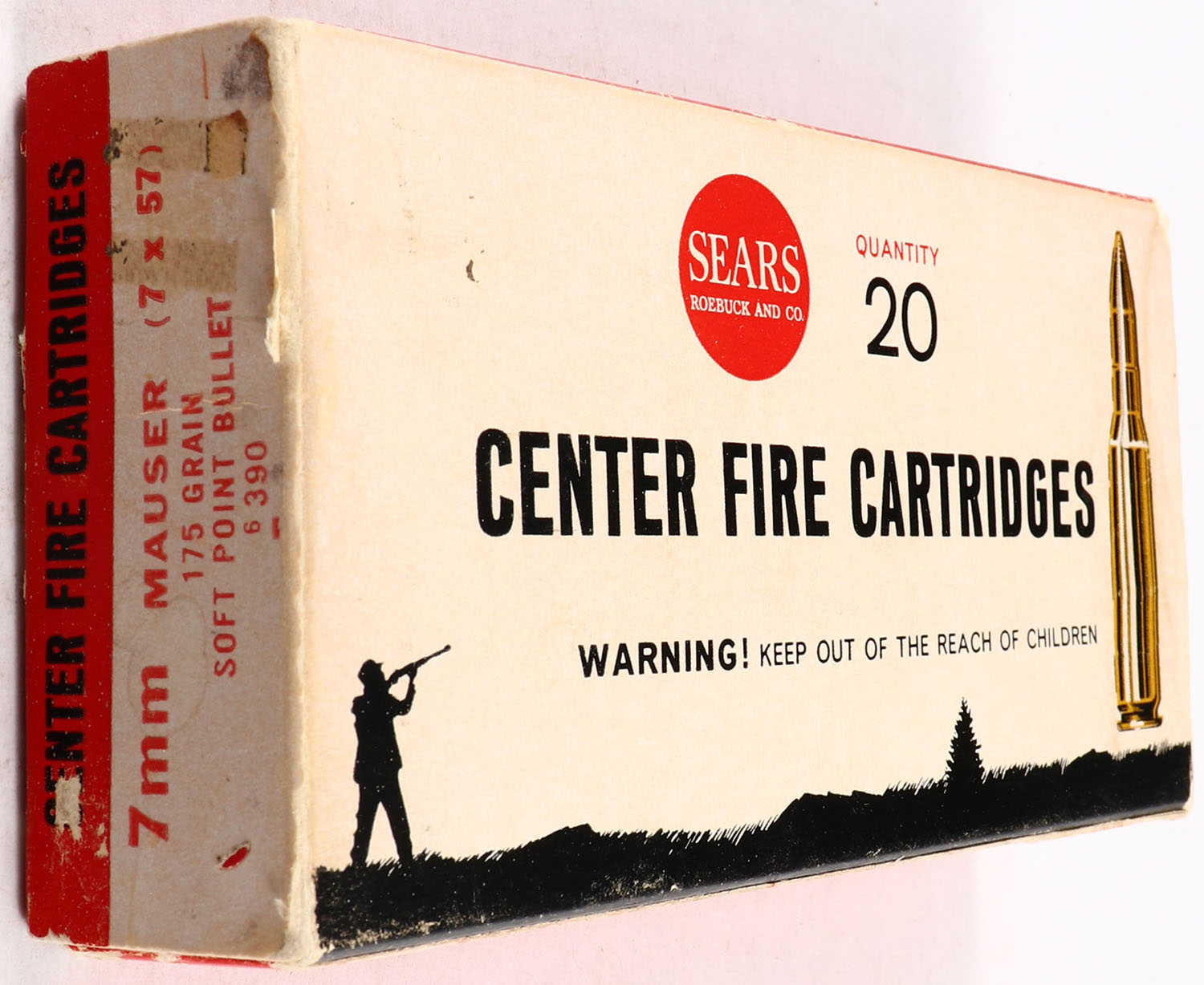 Sears, Center Fire Carts., 7mm Mauser, 175 Gr. Soft Point, 1pc, Full of mixed H.S., Red white & black box, box is solid with rub marks & light corner wear, ammo is very good. Grade: Very Good - Value: 10 to 40