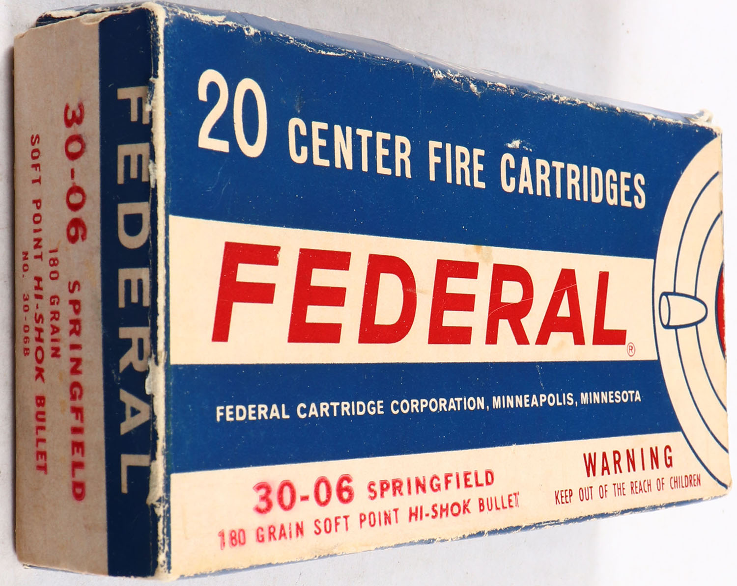 Federal, 30-06 Springfield, 180 Gr. S.P. Hi-Shok Bullet, 1 pc., Full, box shows wear, ammo is very good. Grade: Very Good - Value: 10 to 40