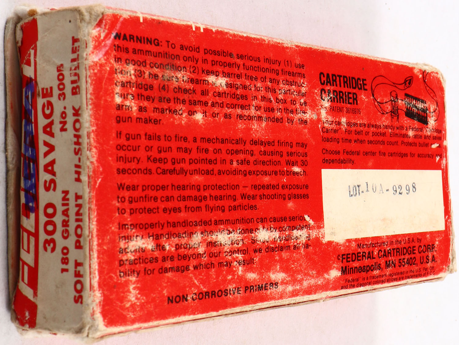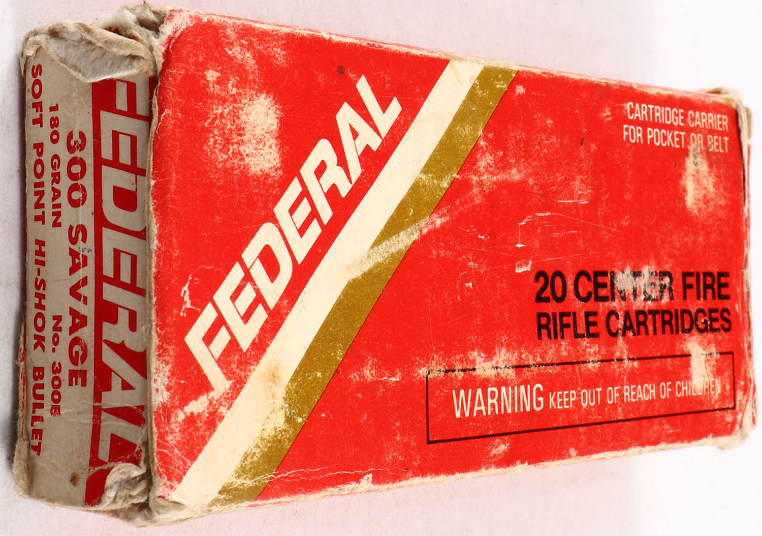 Federal, 300 Savage, 180 Gr. Soft Point, Full, 1pc. Red white & gold box, box has soiling & scuffing, edge & corner wear, ammo is very good. Grade: Good - Value: 10 to 50