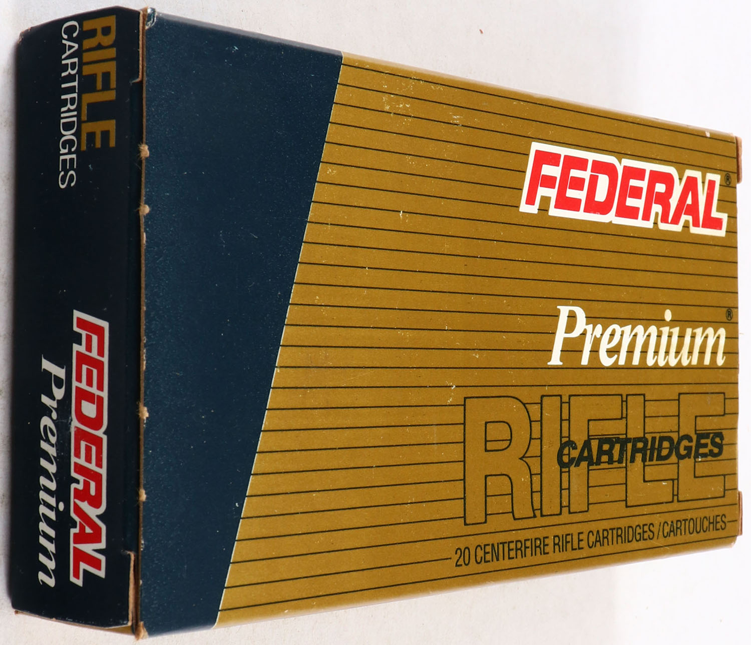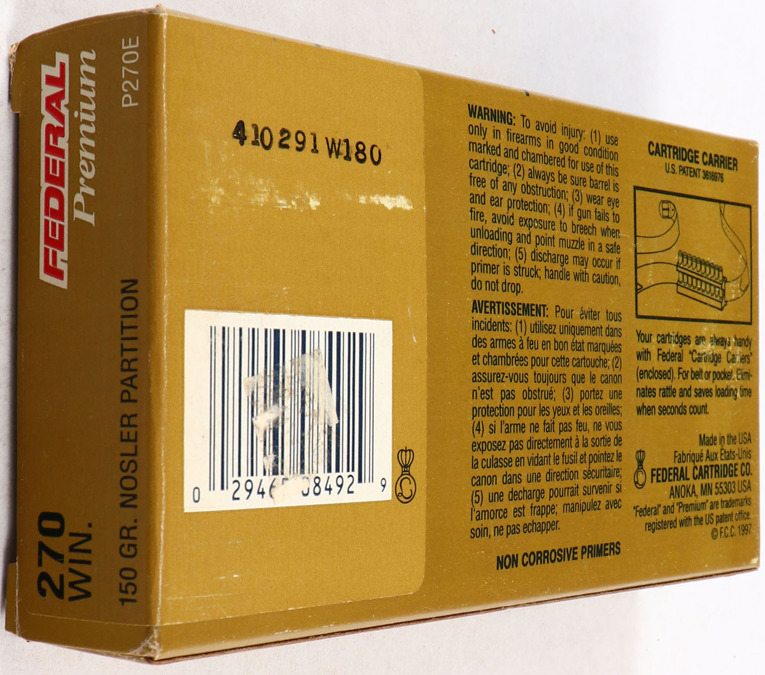 Federal, Premium, 270 WIN., 150 Grain Nosler Partition, Full, 1pc., multi-colored box, box is solid with great color, end flaps are solid, ammo is excellent. Grade: Excellent + - Value: 10 to 30