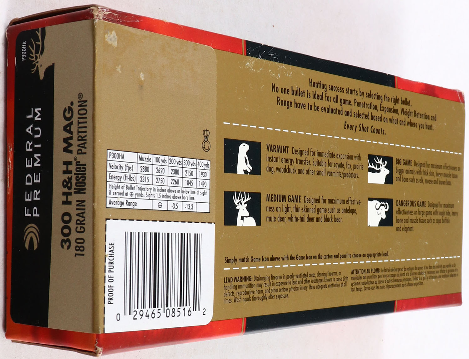 Federal, Vital-Shok, 300 H&H Mag, 180 Grain Nosler Partition, Full, 1pc. Multi-colored box, box is solid with great color, edge & corner wear, end flaps are solid, ammo is excellent. Grade: Excellent ++ - Value: 20 to 80