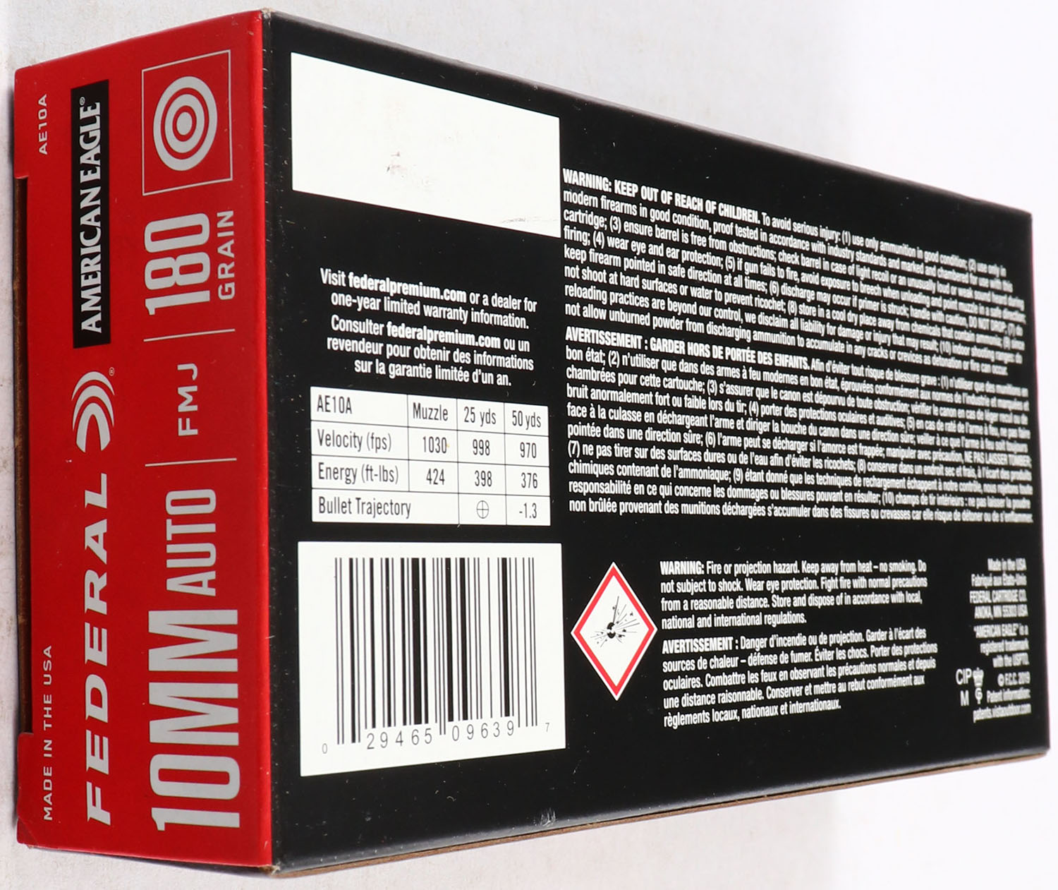 Federal, American Eagle, 10mm Auto, 180 Grain FMJ, Full, 1pc., multi-colored box, box is solid with great color, end flaps are solid, ammo is excellent. Grade: Excellent + - Value: 10 to 40