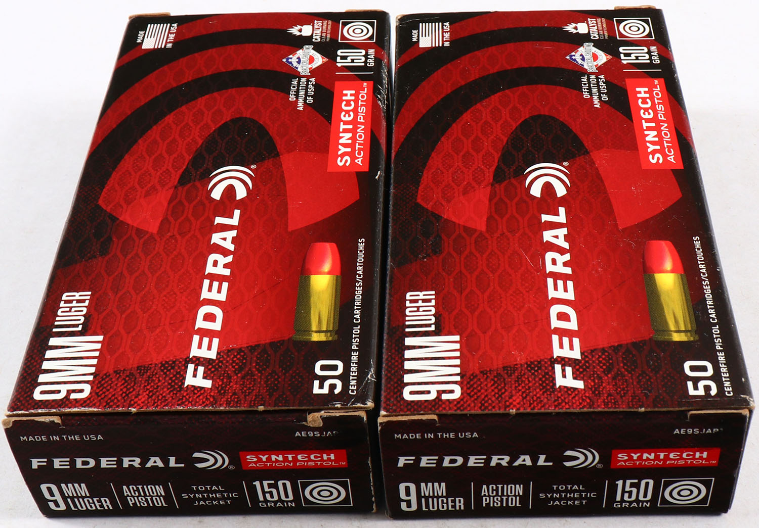 Federal, Lot of 2, American Eagle, 9mm Luger, 150 Grain Total Synthetic Jacket, Full, 1pc., multi-colored box, box is solid with great color, end flaps are solid, ammo is excellent. Grade: Excellent + - Value: 10 to 60