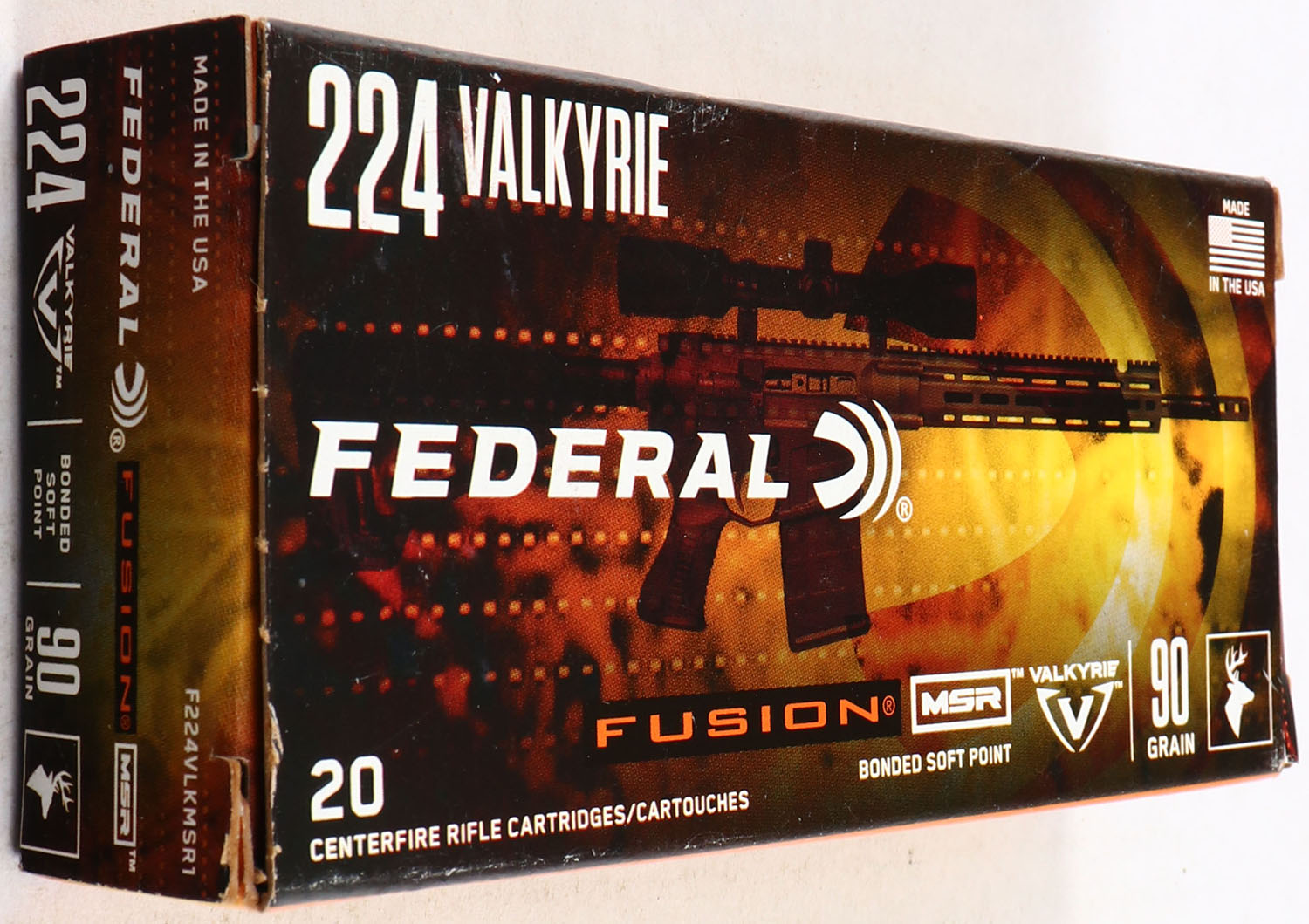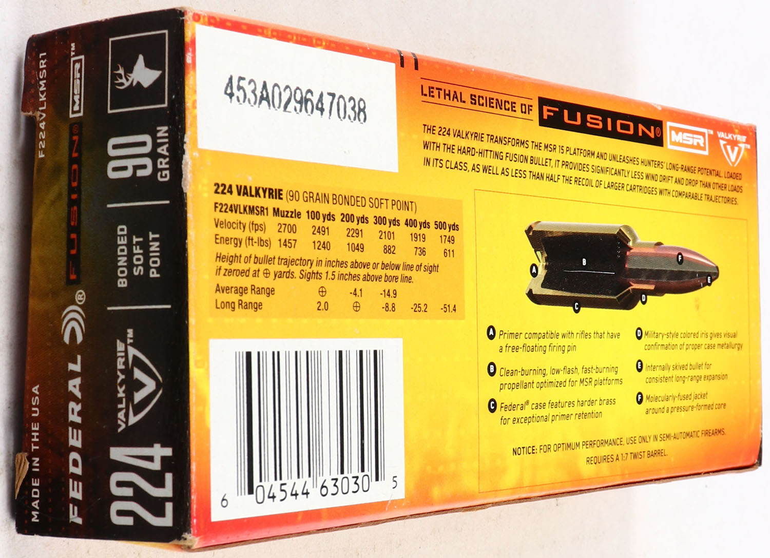 Federal, Fusion, 224 Valkyrie, 90 Grain Bonded Soft Point, Full, 1pc., multi-colored box, box is solid with great color, end flaps are solid, ammo is excellent. Grade: Excellent - Value: 20 to 40