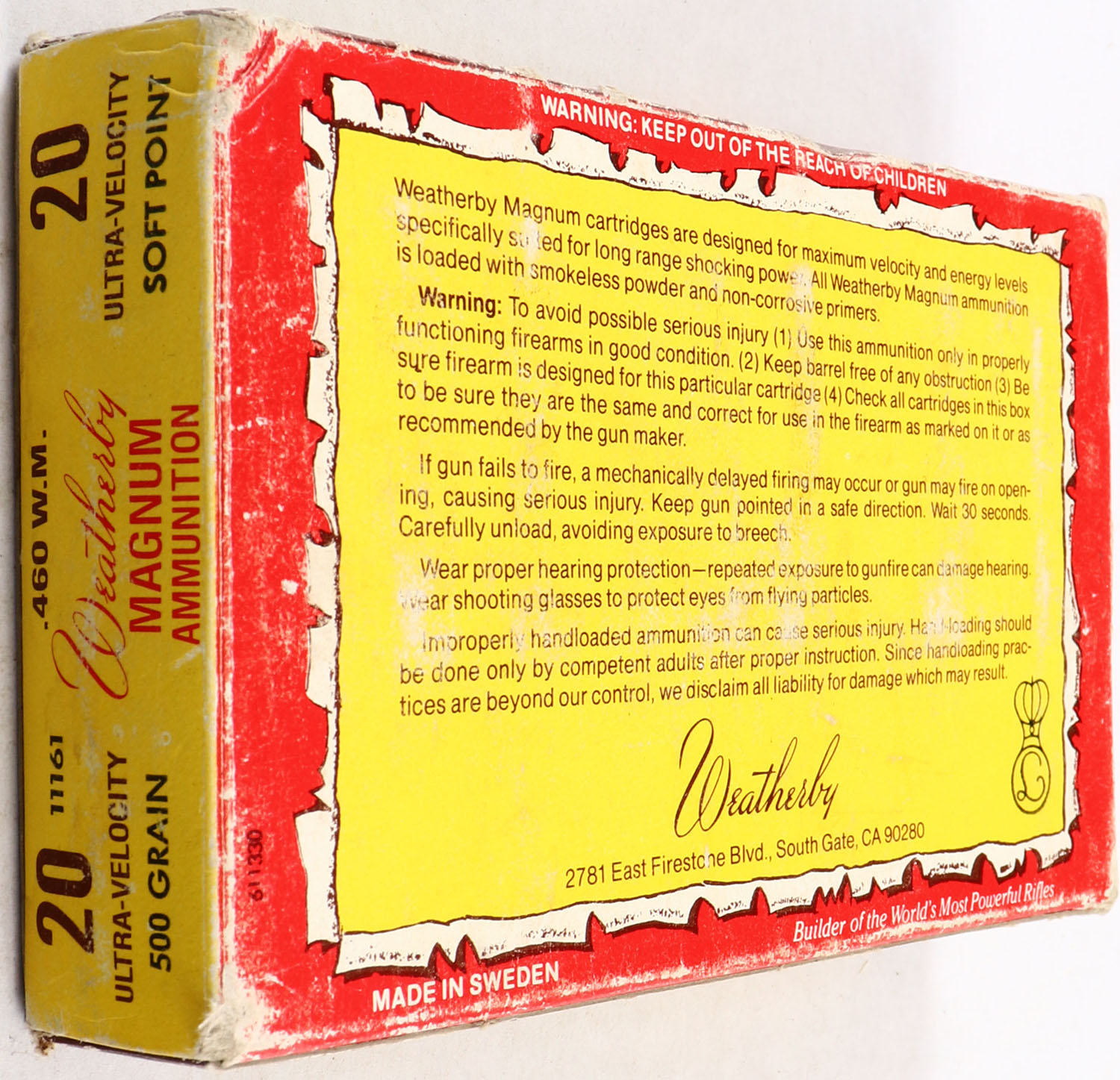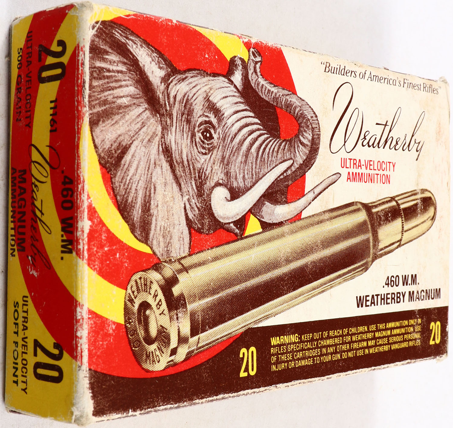 Weatherby, 460 W.M., 500 Grain Ultra-Velocity Soft Point, Partial 19rds, 1pc. multi-colored box, box has shelf wear with edge & corner wear, box is solid with good color, Ammo is excellent. Grade: Very Good ++ - Value: 40 to 200