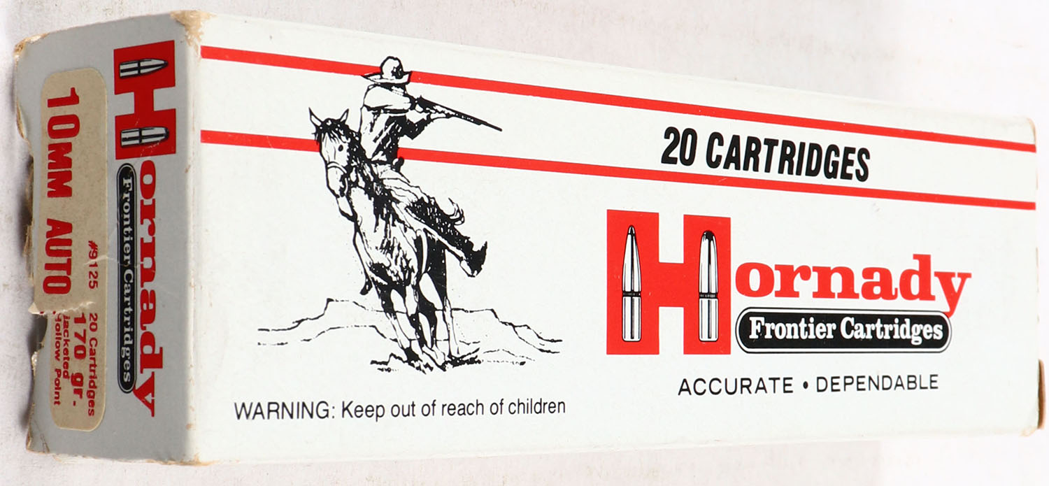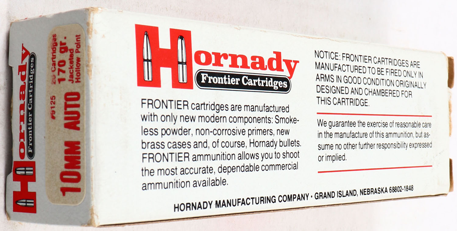 Hornady, Frontier, 10mm Auto, 170 Grain Jacketed H.P., Full, 1pc. multi-colored box, box is solid with excellent color, Ammo is excellent. Grade: Excellent - Value: 10 to 40