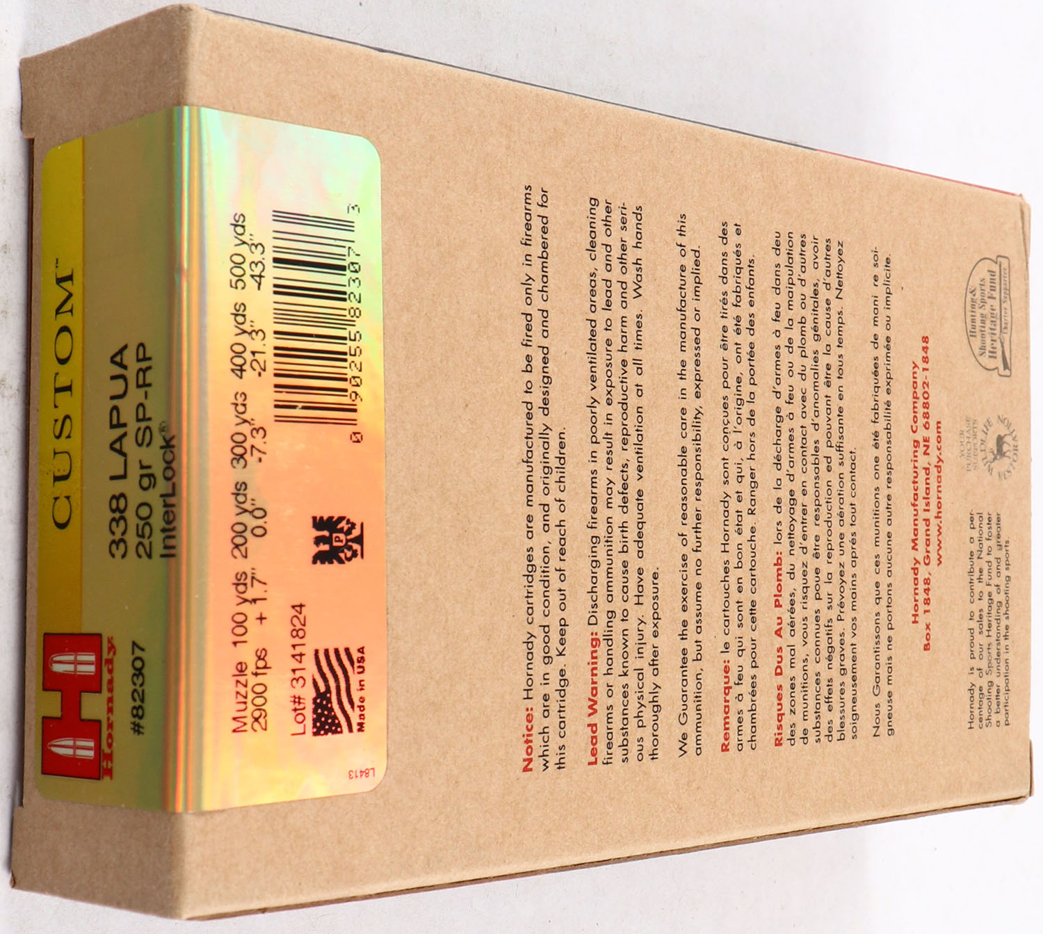 Hornady, Custom, .338 Lapua, 250 Grain SP-RP interlock, Full, 1pc. multi-colored box, box is solid with excellent color, Ammo is excellent. Grade: MINT - Value: 30 to 90