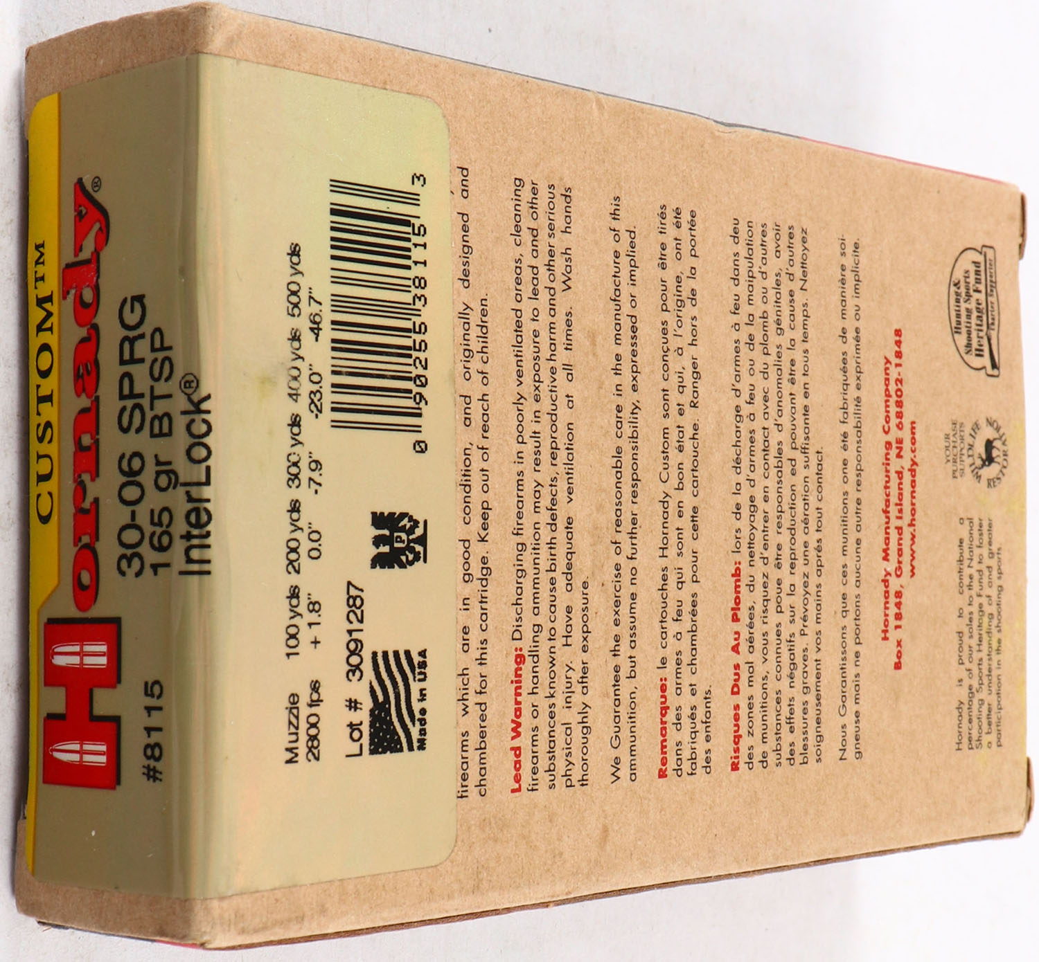 Hornady, CUSTOM, 30-06 SPRG, 165 Grain BTSP Interlock, Full, 1pc. multi-colored box, box is solid with excellent color, Ammo is excellent. Grade: MINT - Value: 20 to 60