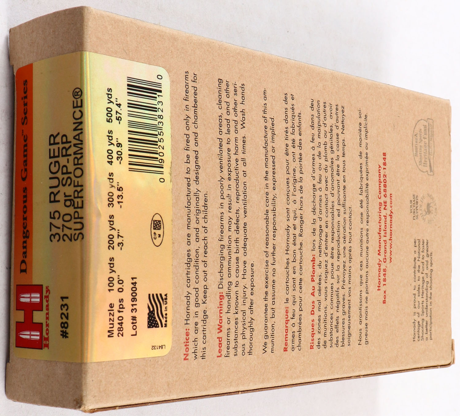Hornady, Dangerous Game Series, 375 RUGER, 270 Grain SP-RP Superformance, Full, 1pc., multi-colored box, box has excellent color, ammo is excellent. Grade: MINT - Value: 20 to 60