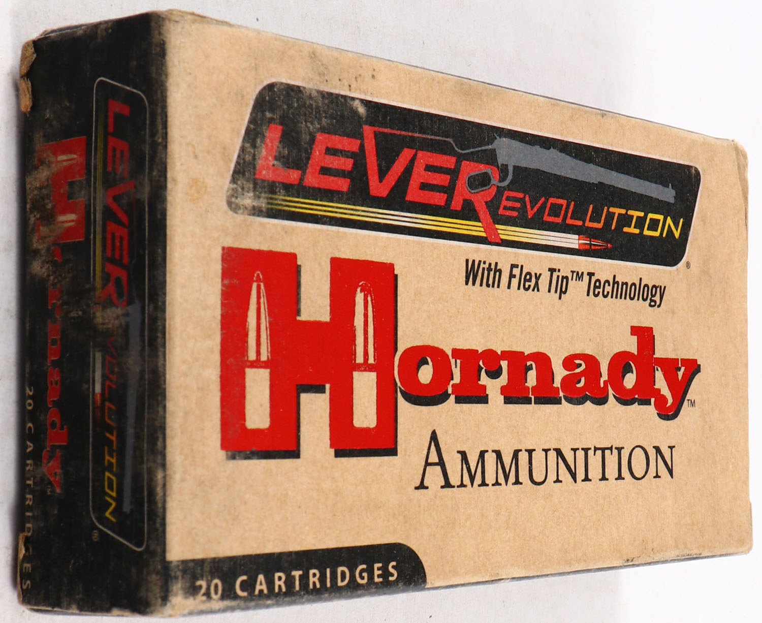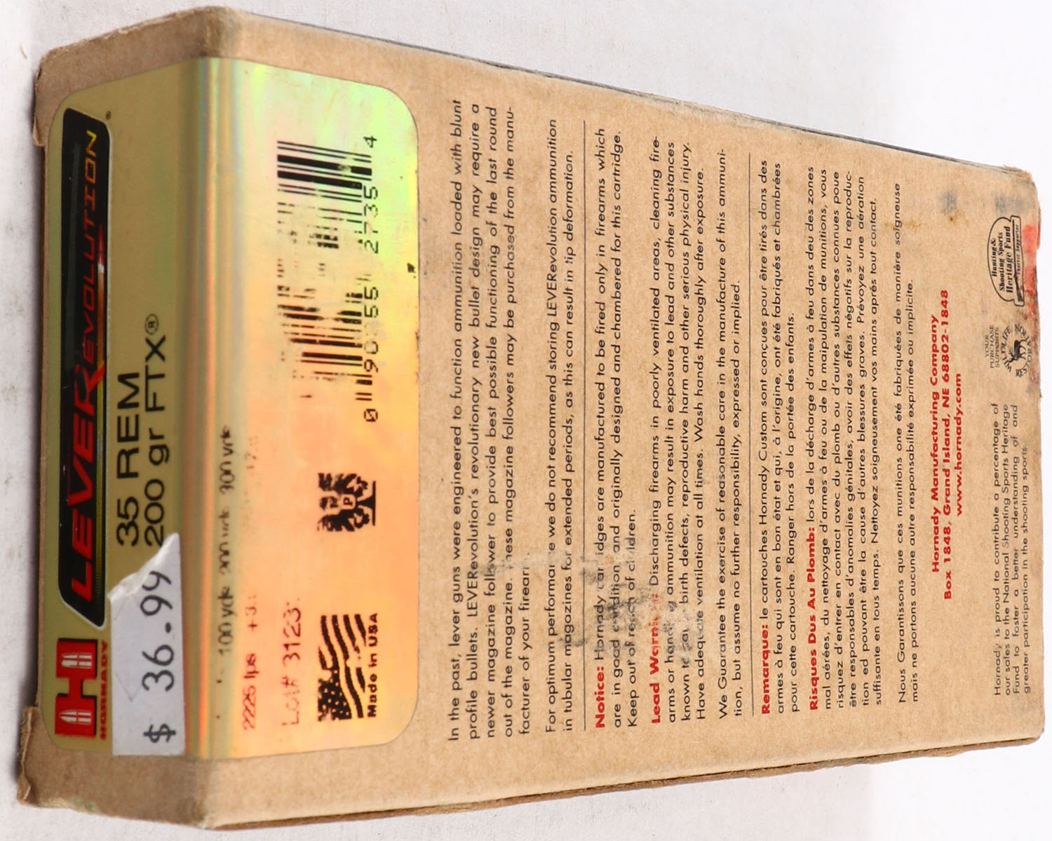 Hornady, LeverEvolution, 35 REM., 200 Grain FTX LeverRevolution, Full, 1pc. multi-colored box, box is solid with excellent color, Ammo is excellent. Grade: Excellent + - Value: 20 to 60
