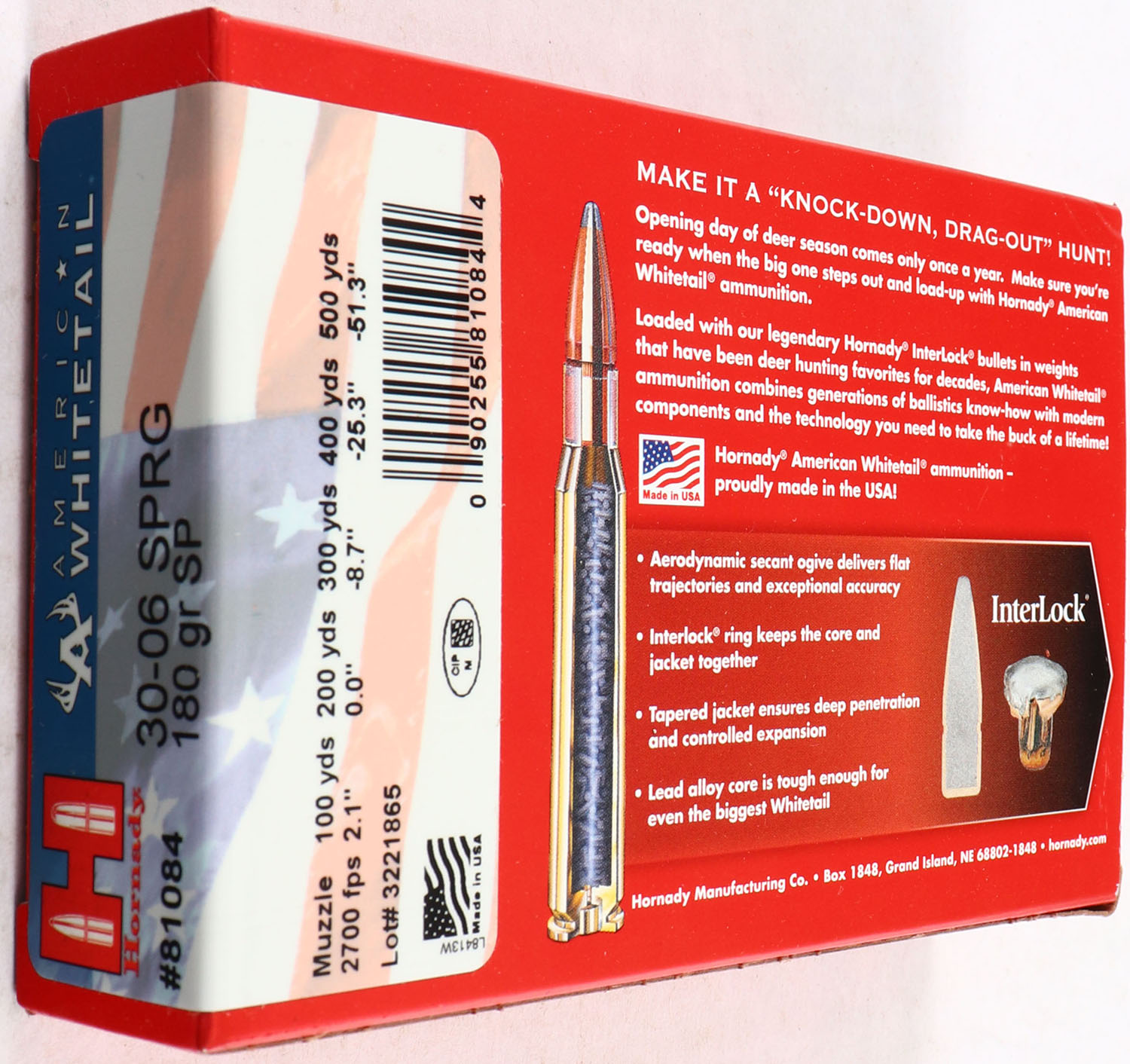 Hornady, American Whitetail, 30-06 SPRG, 180 Grain SP, Full, 1pc. multi-colored box, box is solid with excellent colors, Ammo is excellent. Grade: MINT - Value: 20 to 50