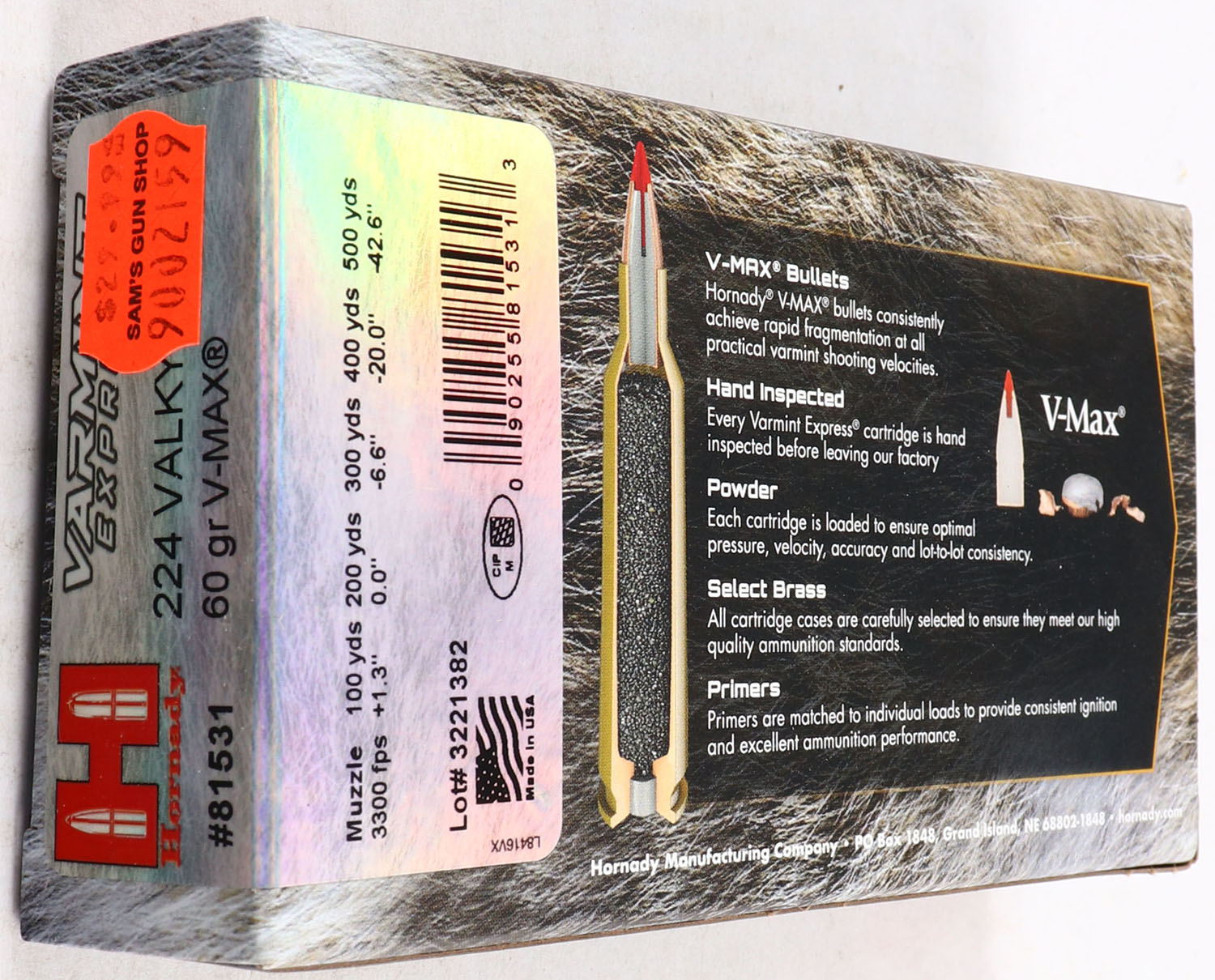 Hornady, Varmint Express, 224 Valkyrie, 60 Grain V-Max, Full, 1pc. multi-colored box, box is solid with excellent color, Ammo is excellent. Grade: Excellent ++ - Value: 20 to 50