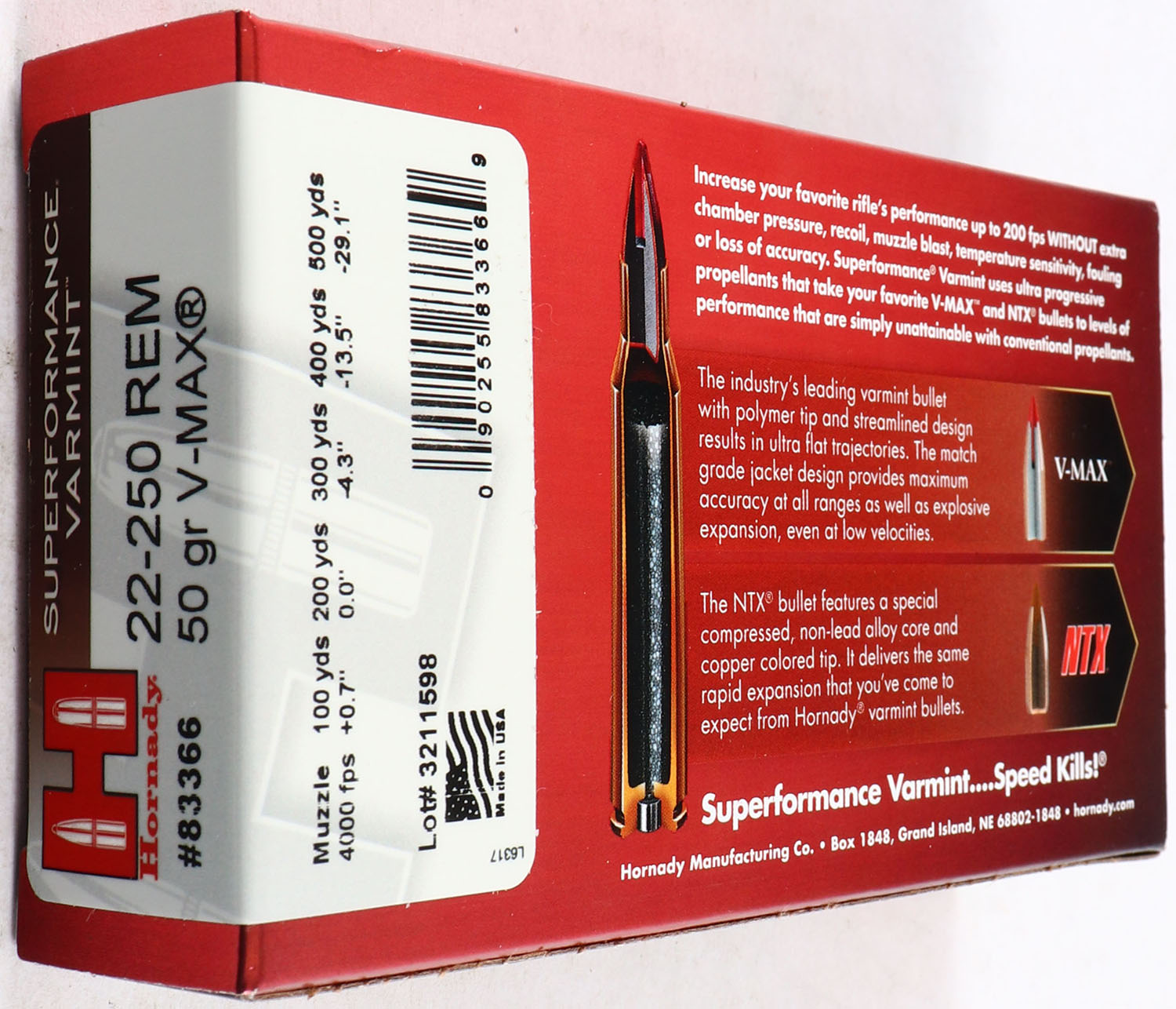 Hornady, Superformance Varmint, 22-250 Rem, 50 Grain V-MAX, Full, 1pc. multi-colored box, box is solid with excellent color, Ammo is excellent. Grade: MINT - Value: 20 to 60