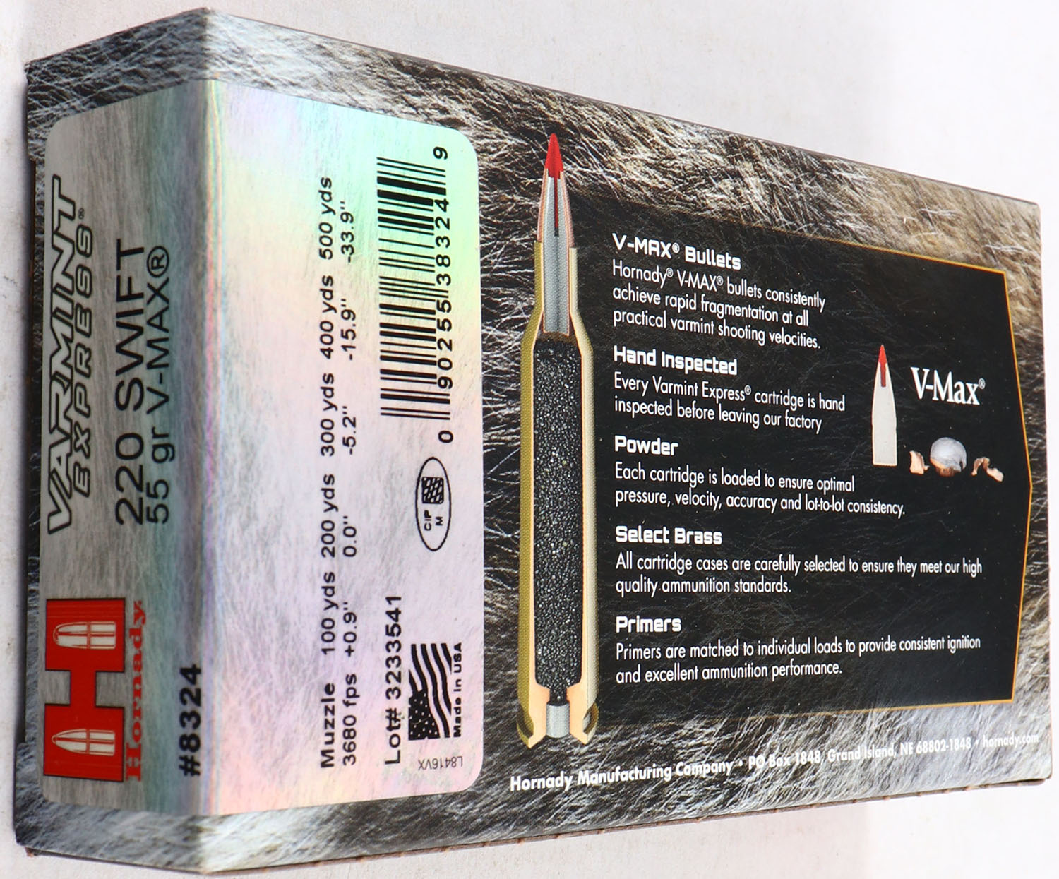 Hornady, Varmint Express, 220 SWIFT, 55 Grain V-Max, Full, 1pc. multi-colored box, box is solid with excellent color, Ammo is excellent. Grade: Excellent ++ - Value: 20 to 50