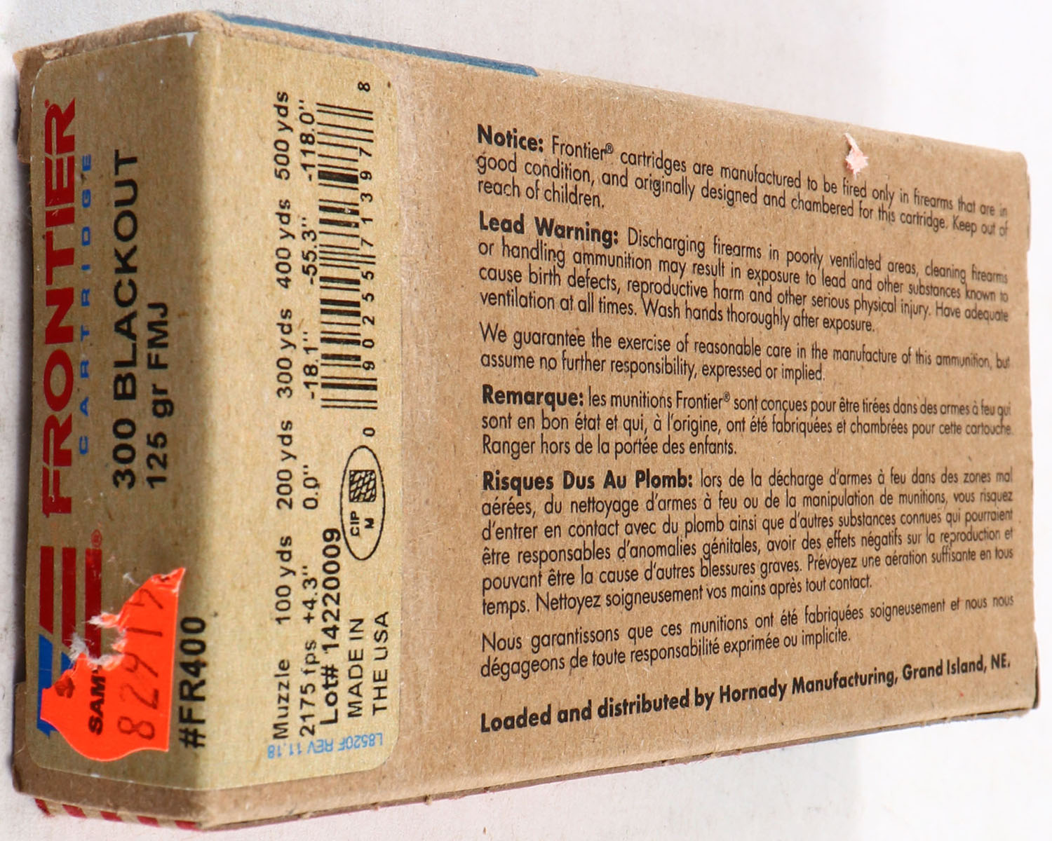 Hornady, Frontier Cartridge, 300 Blackout, 125 Gr. FMJ, multi-colored box, box is solid with excellent color, Ammo is excellent. Grade: Excellent ++ - Value: 16 to 40