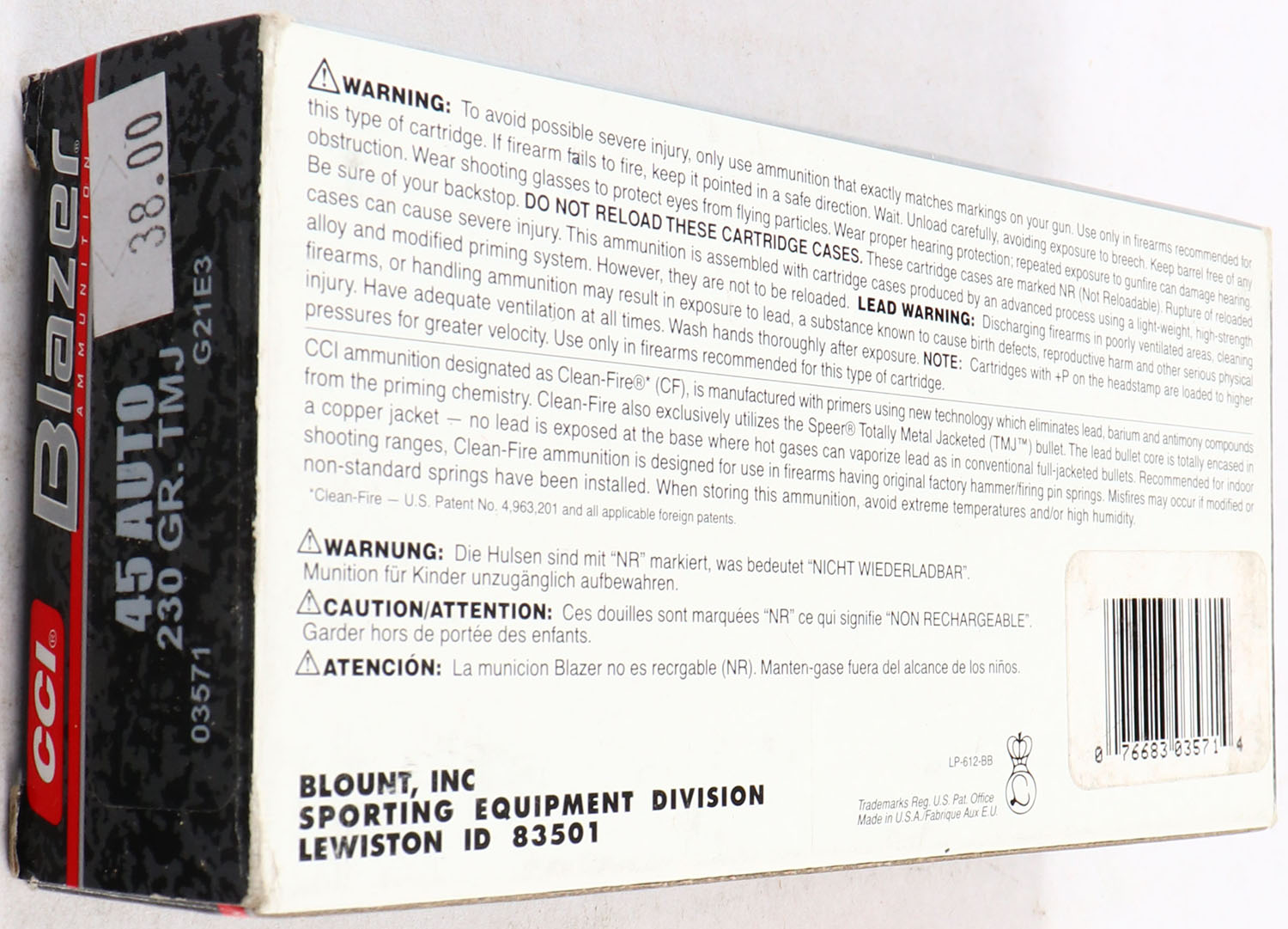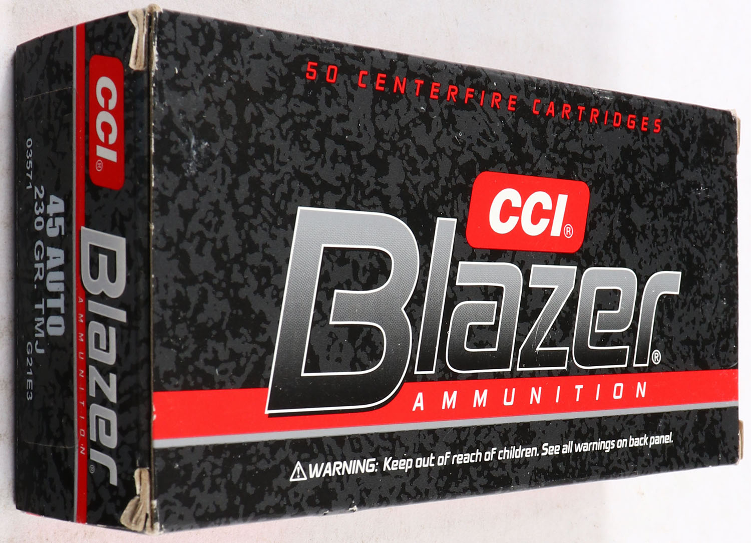 CCI, Blazer, 45 Auto, 230 Grain TMJ, Full, 1pc. multi-colored box, box is solid with excellent color, box has some shelf wear, Ammo is excellent. Grade: Excellent + - Value: 16 to 40