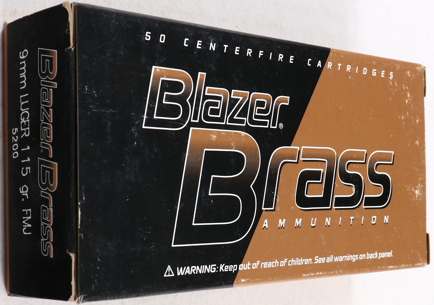 CCI, Blazer Brass, 9mm Luger, 115 Grain FMJ, Full, 1pc. multi-colored box, box is solid with excellent color, Ammo is excellent. Grade: Excellent ++ - Value: 20 to 40