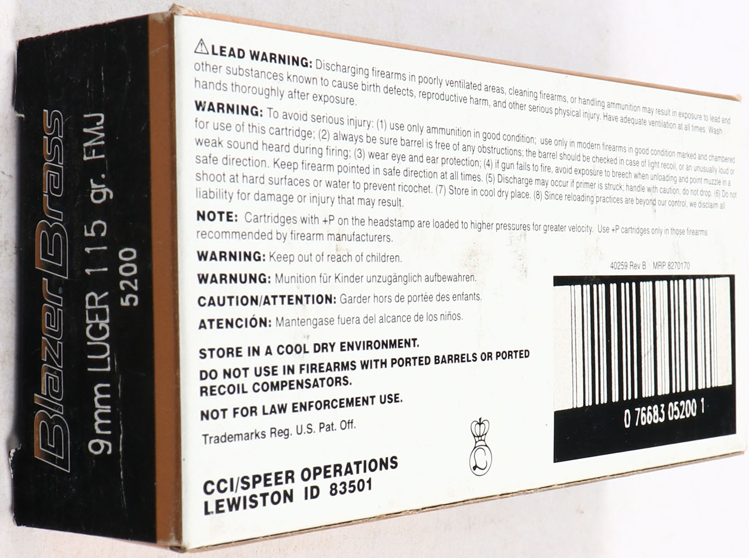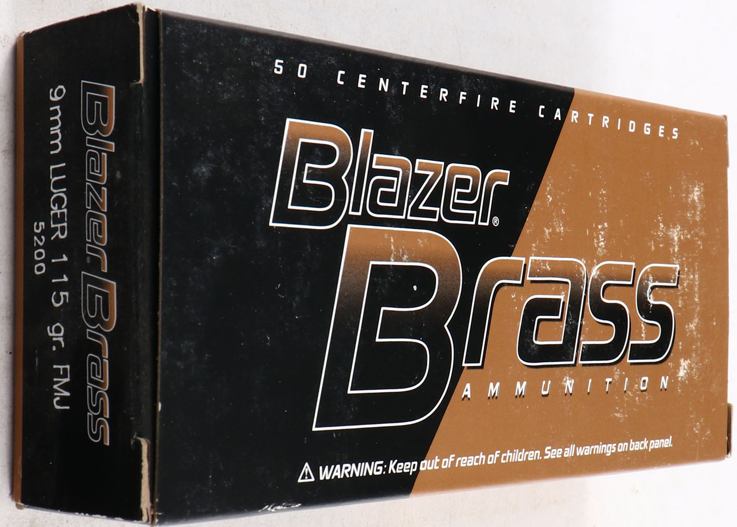 CCI, Blazer Brass, 9mm Luger, 115 Grain FMJ, Full, 1pc. multi-colored box, box is solid with excellent color, Ammo is excellent. Grade: Excellent ++ - Value: 20 to 40